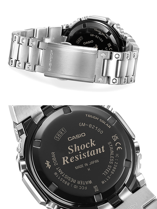 G-SHOCK FULL METAL 2100 Series GM-B2100AD-5AJF ジーショック フルメタル 2100 Series GM-B2100AD-5AJF 【G-SHOCK(ジーショック)】 強さは、さらなる高みへ。 時計にタフネスという 新たな概念を築き上げたG-SHOCK。 すべては、落としても壊れない時計を つくるという開発者の熱き信念、当時の常識を覆す、無謀ともいえる挑戦から始まった。 1981年、プロジェクトチーム・タフ結成。 200を超える試作が繰り返され、約2年にも及ぶ歳月が費やされた。完成したのが、耐衝撃構造。 タフの中核を担うテクノロジーの誕生である。以来、G-SHOCKは、 終わりなき進化を続けてきた。 構造、素材、機能。 あらゆる面から、 さらなるタフを追い求めて。 そして今、そのあくなき挑戦、たゆまぬ努力が、3つの重力加速度に耐える強化構造、TRIPLE G RESISTに結実。 さらに、あらゆる環境下での使用に 応えるオールマイティタフの追求により、軽快かつ確実な操作性を叶える SMART ACCESSの搭載を実現。 どこまでも強く。その先の強さを目指して。 G-SHOCK、その挑戦に終わりはない。 G-SHOCK初代モデルDW-5000Cのコンセプトを受け継いで開発されたアナログ「2100」シリーズのフルメタルモデルです。 スクリューバックケース、ベゼル、バンドにステンレスを採用し、 落下時の衝撃からモジュールを守る耐衝撃構造をとりながらも、無駄を省いたシンプルなデザインを目指しました。 高密度実装技術によりスリムで高機能なモジュールを搭載することで薄型化を実現。着け心地の良さにもこだわりました。 ステンレス製のベゼルは、天面を円周状のヘアライン、斜面をミラー研磨で美しく仕上げています。 Bluetooth通信により専用アプリと接続し、正確な時刻情報を取得可能。 タフソーラー、高輝度なダブルLEDライトなど実用的な機能も備えています。 【ワールドタイム】 ワールドタイム:世界38都市(38タイムゾーン、サマータイム自動設定機能付き)+UTC(協定世界時)の時刻表示、ホームタイムの都市入替機能 【ストップウオッチ】 ストップウオッチ(1/100秒(1時間未満)/1秒(1時間以上)、24時間計、ラップ/スプリット付き) 【タイマー】 タイマー(セット単位:1秒、最大セット:60分、1秒単位で計測) 【アラーム】 時刻アラーム5本・時報 【ライト】 ダブルLEDライト:文字板用LEDライト(スーパーイルミネーター、残照機能、残照時間切替(1.5秒/3秒)付き) LCD部用LEDバックライト(スーパーイルミネーター、残照機能、残照時間切替(1.5秒/3秒)付き) 【ライトカラー】 LED:ホワイト 【カレンダー】 フルオートカレンダー 【パワーセービング機能】 パワーセービング機能(暗所では一定時間が経過すると運針を停止して節電します) 【バッテリー表示/警告】 バッテリーインジケーター表示 【駆動時間】 フル充電時からソーラー発電無しの状態での駆動時間 機能使用の場合:約7ヵ月 パワーセービング状態の場合:約18ヵ月 【精度】 ※スマートフォンと連携しない場合は、通常のクオーツ精度(平均月差±15秒)で動作します。 【その他機能】 針退避機能(針が液晶表示と重なって見づらいときは、針を液晶表示の上から一時的に退避させることができます) 12/24時間制表示切替 日付表示(月/日表示入替) 曜日表示(英・西・仏・独・伊・露の6ヵ国語切替) 【モバイルリンク機能】 モバイルリンク機能(対応携帯電話とのBluetooth通信による機能連動) 【アプリ】 「CASIO WATCHES」対応 【アプリ連携機能】 自動時刻修正 / 簡単時計設定 / ワールドタイム約300都市 / タイム&プレイス / 携帯電話探索 / リマインダー | ||||