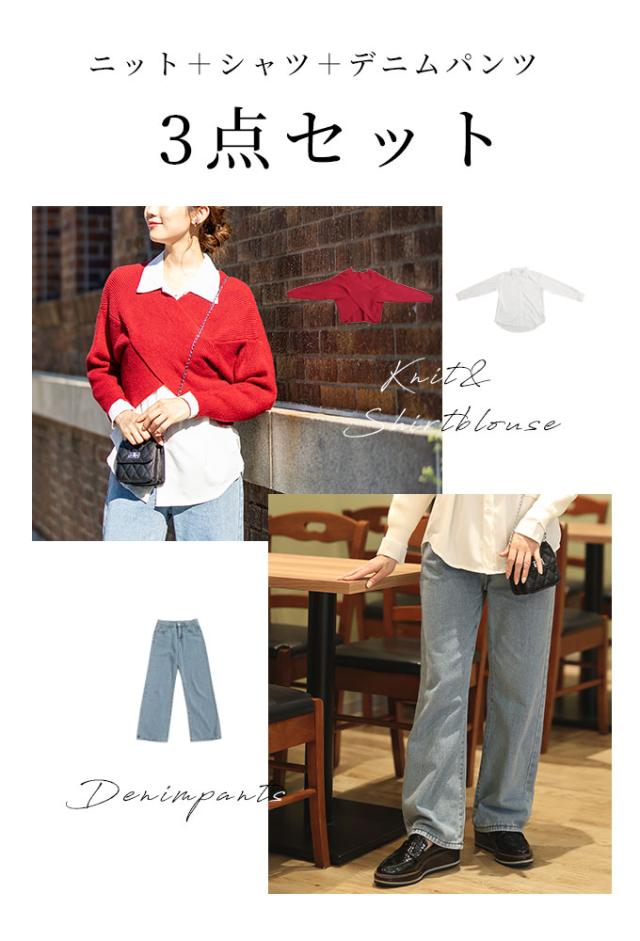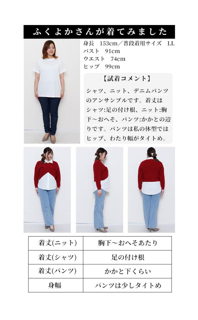 【シャツ】着丈前 66cm 着丈後 72cm バスト 51cm 袖丈 52cm 肩幅 44cm 裾幅 51cm 首幅 16cm アームホール 22cm 袖口 9cm 【ニット】着丈 44cm バスト 45cm 袖丈 39cm 肩幅 49cm 裾幅 36cm 首幅 13cm アームホール 21cm 袖口 6.5cm 【パンツ】着丈 96cm ウエスト 34cm ヒップ 43cm 前股上 31cm 後股上 37cm 股下 65cm 裾幅 23cm【S-LLサイズ相当】