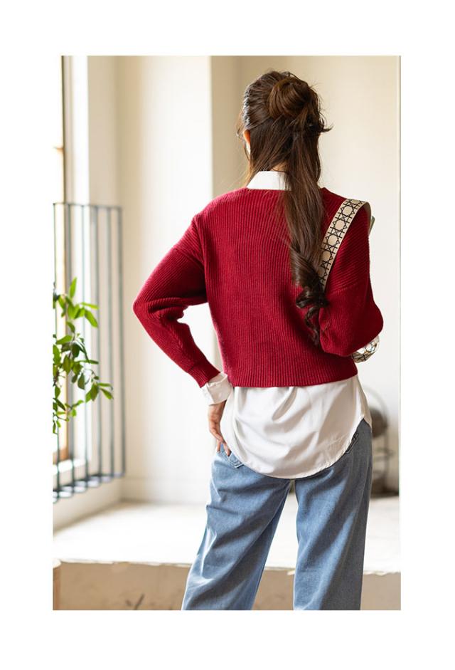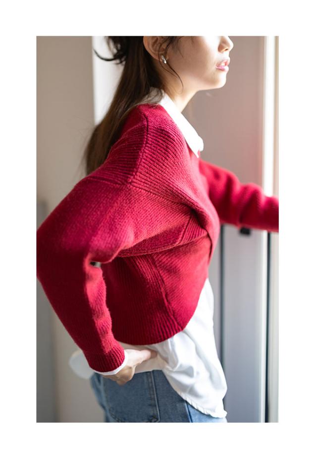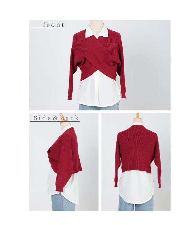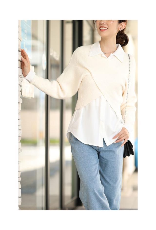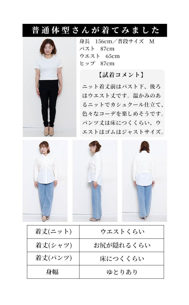ニット着丈前はバスト下、後ろはウエスト丈です。温かみのあるニットでカシュクール仕立て、色々なコーデを楽しめそうです。シャツ着丈はヒップが隠れるくらい、袖丈は手の甲に少しかかるくらいです。程よいゆとりとストレッチ性がありサラッとしていてやや透け感があります。パンツ丈は床につくくらい、ウエストはゴムは入っておらずジャストサイズでした。脚のラインを拾わないやや太めのストレートです。