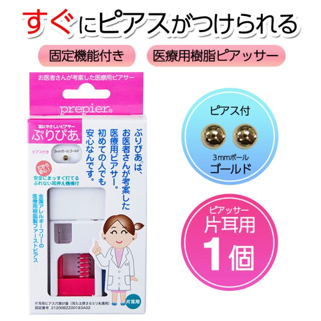 ピアッサー ぷりぴあ 片耳用 ゴールド 3mmボール 医療用樹脂製ピアサー prepier 透明ピアス 金属アレルギーフリー ファーストピアス ワンダ—ワークス