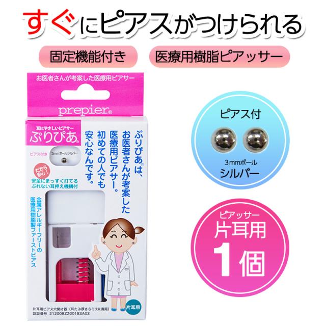 ピアッサー ぷりぴあ 片耳用 シルバー 3mmボール 医療用樹脂製ピアサー prepier 透明ピアス 金属アレルギーフリー ファーストピアス ワンダ—ワークス