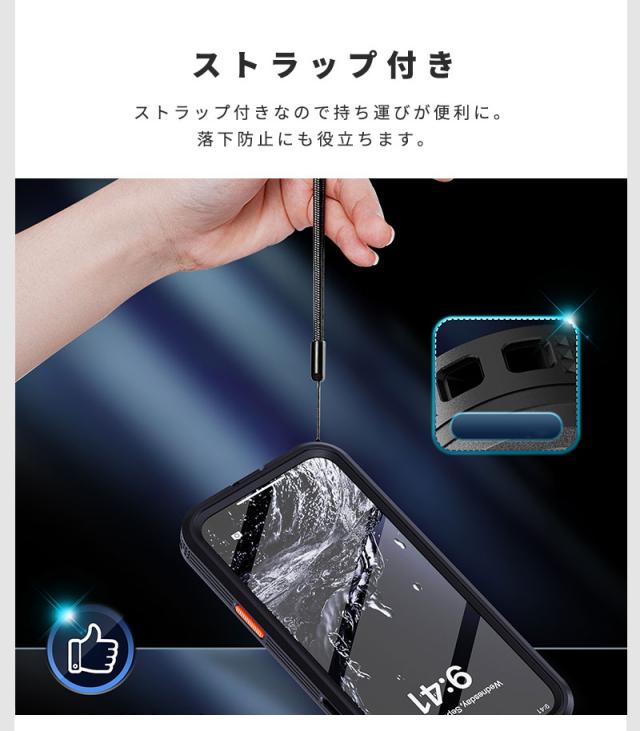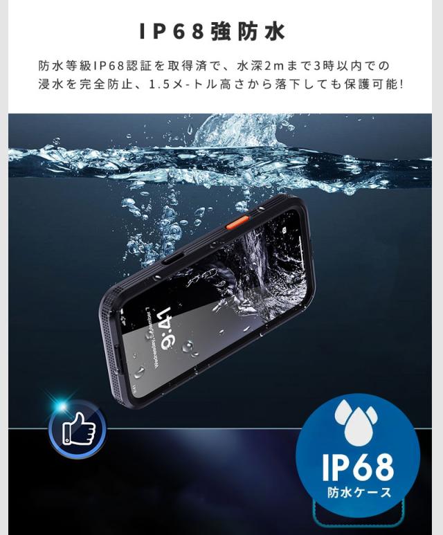 防水等級IP68認証を取得済で、水深2mまで3時以内での浸水を完全防止、1.5メ-トル高さから落下しても保護可能!