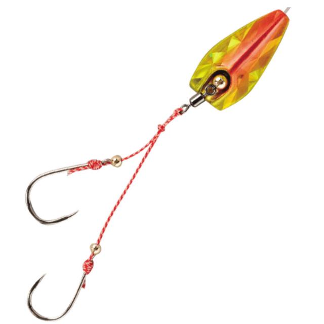 バラシ激減、高感度。リフト&フォールで妖しくゆらめくインチク形状。ロングシャンクが海エビをしっかりホールドする小鯛鈎使用。ヘッドとフックを遊動にする事によりフックUP後の鯛特有の首振りによるバラシを激減。またフォール中にバイトしてきた鯛に違和感を与えず喰い込ませる事が可能になりました。