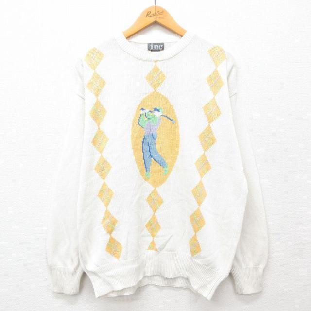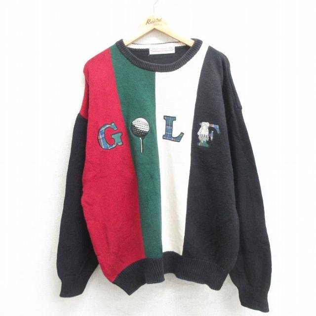 古着 長袖 セーター メンズ 00年代 00s ゴルフ 刺繍 アーガイル 大きいサイズ コットン クルーネック 紺他 ネイビー XLサイズ 中古 古着