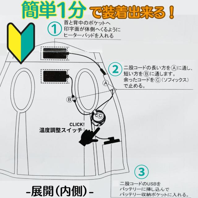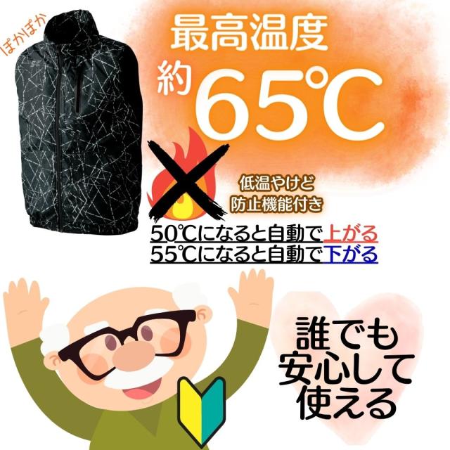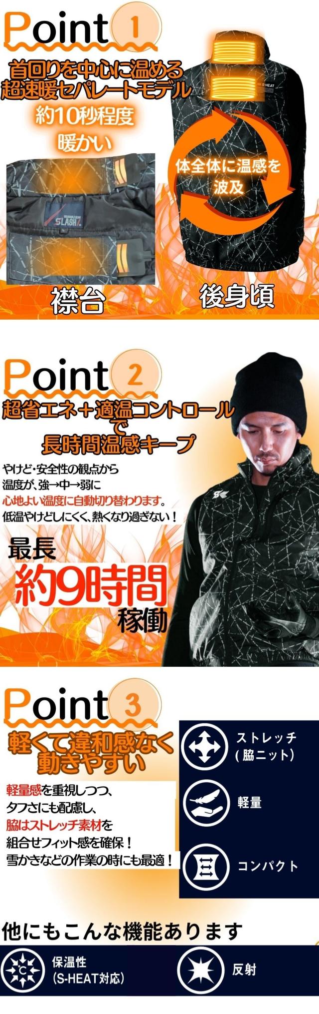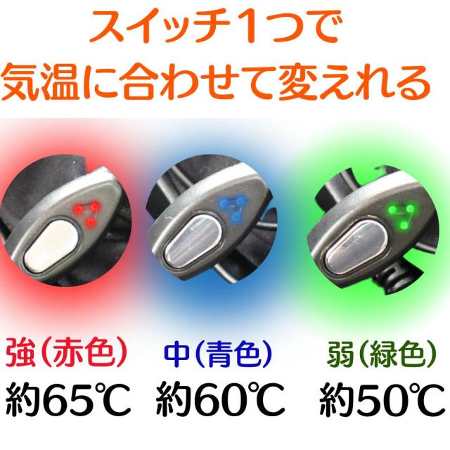 【連続稼働時間(目安)】温度:強(赤)約6.5時間(※強は一定の時間で自動切換する為、実際には連続使用出来ません。稼働時間はあくまで仕様の目安です)【連続稼働時間(目安)】温度:中(青) 約9時間【連続稼働時間(目安)】温度:弱(緑) 約12.5時間軽量感を重視しつつ、タフさにも配慮したマイクロリップにグラフィックを乗せることで奥行きのあるカラーを実現、脇はストレッチ素材を組合せフィット感を確保!雪かきなどの作業の時に、暖かくそして違和感なく動けます!熱伝導率、遠赤外線変換率に優れるグラフェン(炭素素材)の特徴を活かし、 ヒーターのコンパクト化を実現したことでセパレートモデルながら温感を感じやすい首回りへのヒーター配置を標準化。少量のパットで最大効果があり、体の芯まで温めることを可能にしている。温度のスイッチを入れると強(赤色)が点滅いたしますが、やけど・安全性の観点から10分で中(青色)、20分で弱(緑色)に心地よい温度に自動的に切り替わります。自動でも出来ますが、スイッチを何度か押すとお好みの温度に調整出来ます。