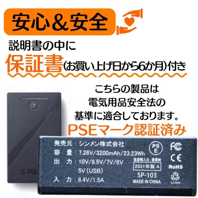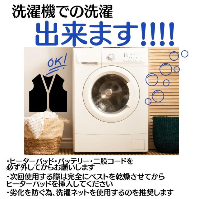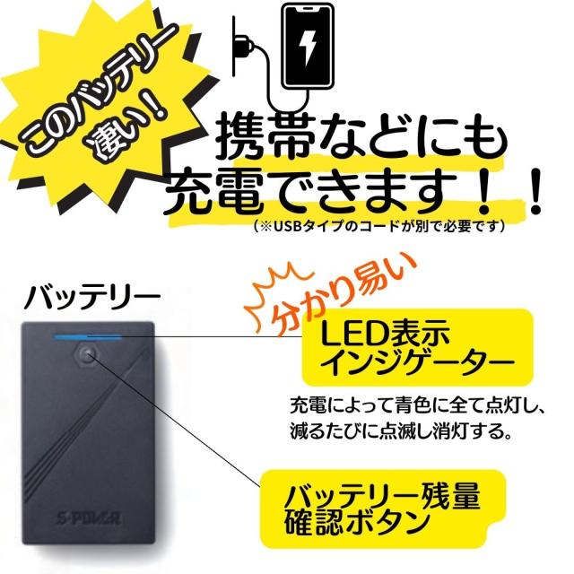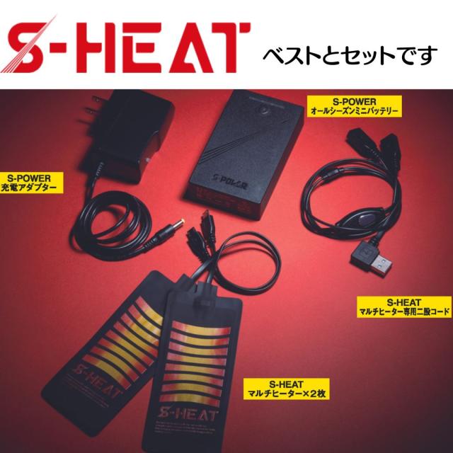 (素材(ベスト) 表地・中綿・裏地ポリエステル100%内容物 ウエア(ベスト)・S-POWER オールシーズンミニバッテリー・S-POWER 充電アダプター・S-POWER マルチヒーター・S-POWER マルチヒーター専用二股コード・取扱説明書兼保証書(お買い上げ日から6か月)バッテリー仕様 ■定格容量:DC7.26V/3200mA(PSEマーク認証済み)■定格入力:DC8.4V/1.5A■定格出力:5V(USB)■外形寸法:幅59×高99×厚22mm■質量:約140g■充電時間:5V2A/約3〜3.5時間(目安)■使用可能気温:-15℃〜40℃■充電回数:500回充電100%(満タン)だと青色に全て点灯します。減るたびに点滅し消灯していきます。ヒーターパッド仕様 ■外形寸法:幅56×高195×厚7mm■使用可能気温:-10℃〜40℃※インバーター制御による省エネ設計を採用連続稼働時間(目安)温度:強(赤) 約5時間(※強は一定の時間で自動切換する為、実際には連続使用出来ません。稼働時間はあくまで仕様の目安です)連続稼働時間(目安)温度:中(青) 約7時間連続稼働時間(目安)温度:弱(緑) 約9時間注意事項 ■長時間使用する場合は、低温やけどや脱水症状を起こすことがありますので、注意してください■洗濯時にはヒーターパッド・バッテリー・二股コードを必ず取り外ししてください■S-HEATを着用したまま眠らないでください。低温やけどの恐れがあります。■S-HEATの内側に必ず下着を着用してください。素肌に直接触れると低温やけどの恐れがあります。■初めて使用される場合は取り扱い説明書を最後までよくお読みいただき、充電してから正しく安全にご使用ください。■商品の撮影には最大限注意を払っておりますが、閲覧時のモニター環境によりましては実際の商品と若干違うお色味に映ることもございます。ご了承ください