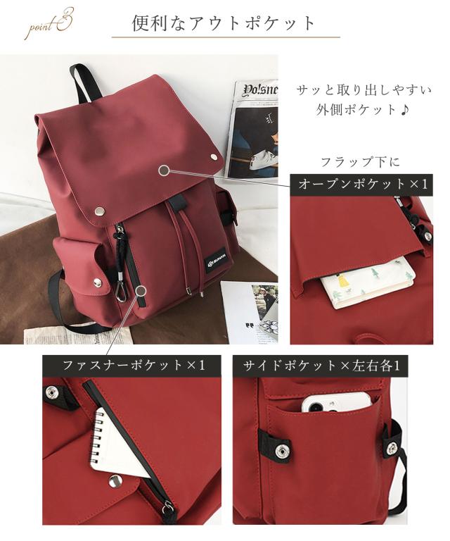 - この商品に決めたのはポケットにスナップカバーが付いていて、見た目もオシャレだったから。届いてみて、スマホは横のポケットだと少しはみ出してしまい、スナップがハマらない事が分かりましたが、後ろの外側にもポケットがあって、横にすれば問題無くスマホも入りスナップもハメられるので、安心しました。防犯バッチリな感じです。雨が降っても水も弾きそうだし、これでスナップが取れてしまったりしなければ、荷物もしっかり入るし、長く使えそうです。