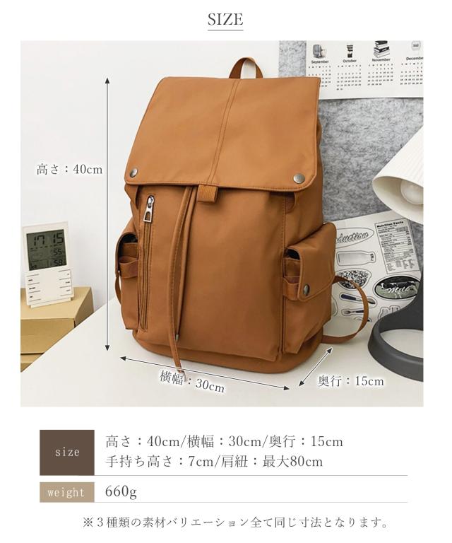 高さ40cm/横幅30cm/奥行(底マチ)15cmと大きめで、A4資料やノートPCもラクラク入る大容量◎