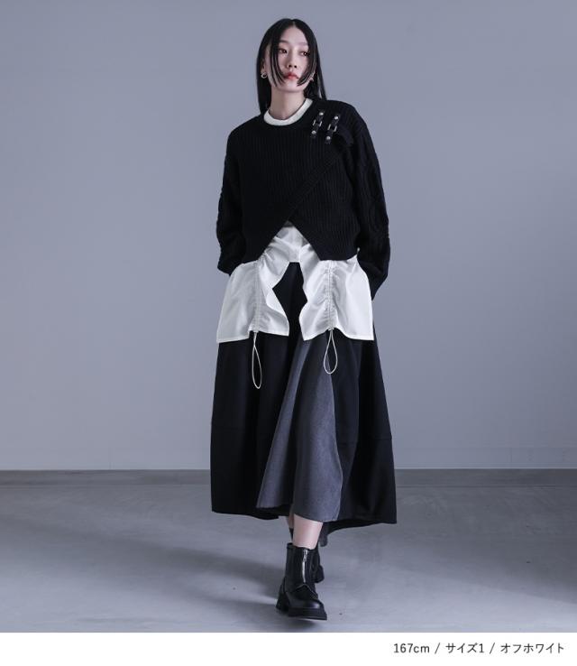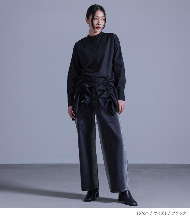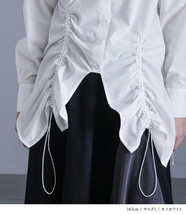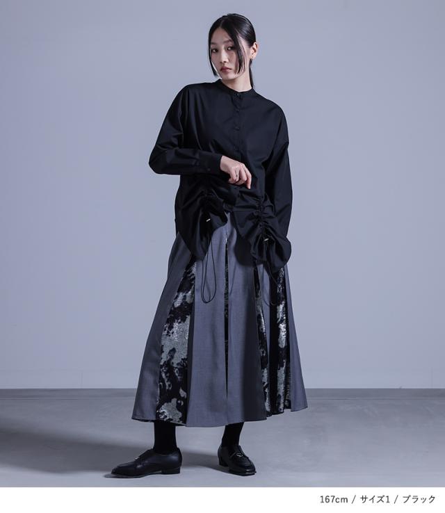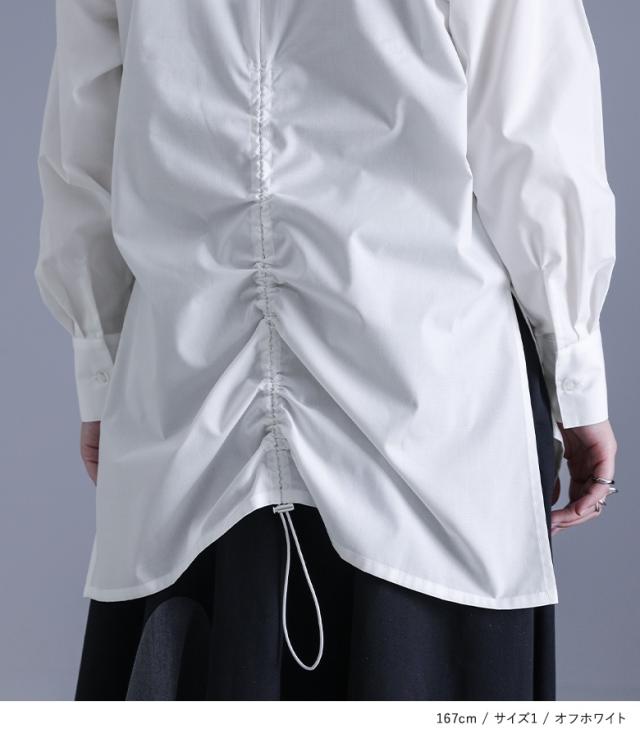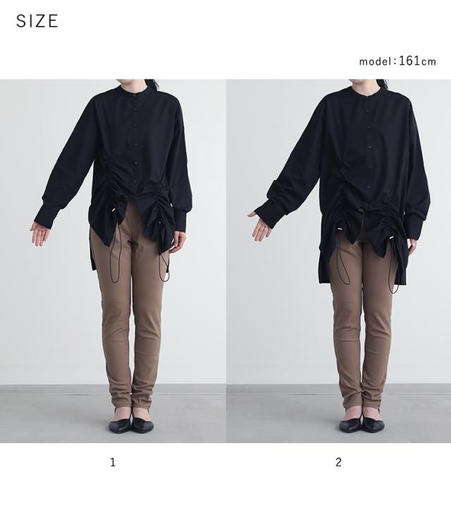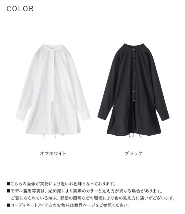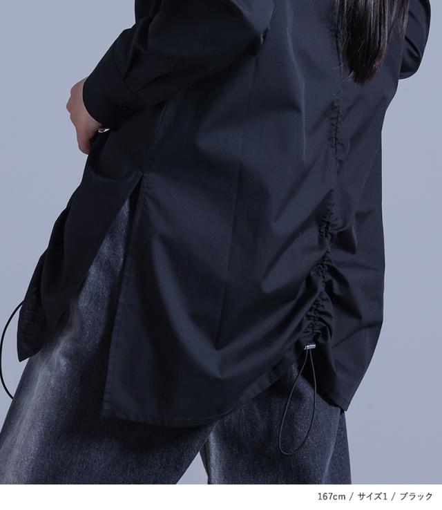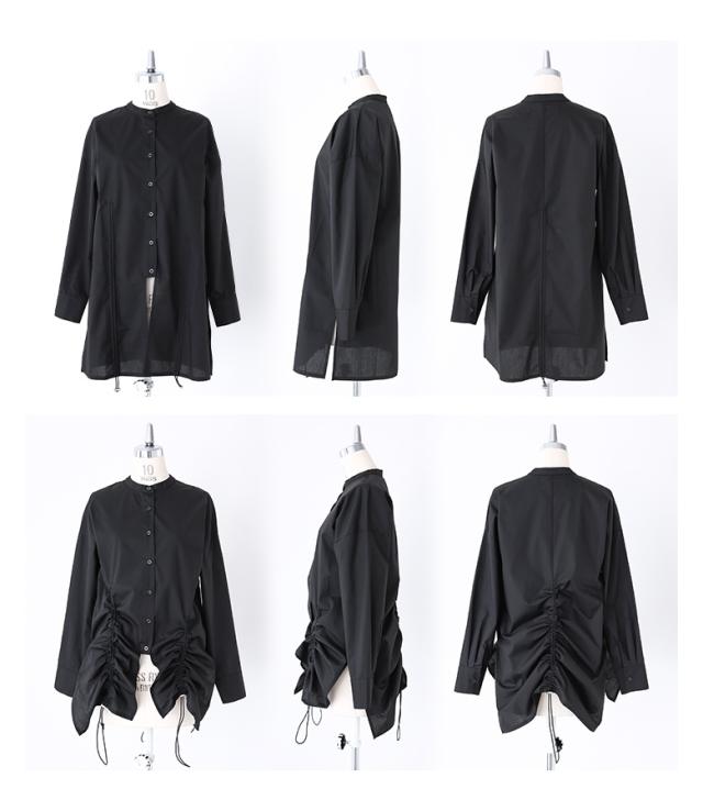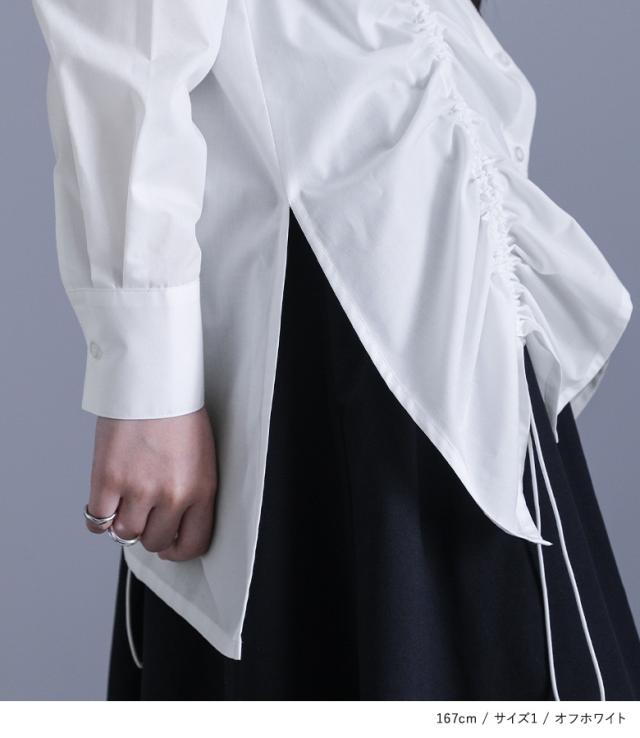 ■デザイン 身頃のドロストで自由にシルエットを変えられる変形デザインシャツ。ドロストの位置を左右でアシンメトリーにしたり、バックにもドロストを施したり、深めのサイドスリットを入れたりと、どこから見ても表情のあるモードな一着に仕上げました。ドロストを全て下げて、ロングシャツとしても使いやすいデザインです。 ■コーディネート 無地生地なので、シンプルなボトムスはもちろん柄物とも好相性。バンドカラーでニットなどのレイヤードも楽しめる、スタイリングの幅が広がるアイテムです。 ■素材 さらっとした肌触りの良いシャツ生地。コットン混で心地良く着用して頂けます。 |
