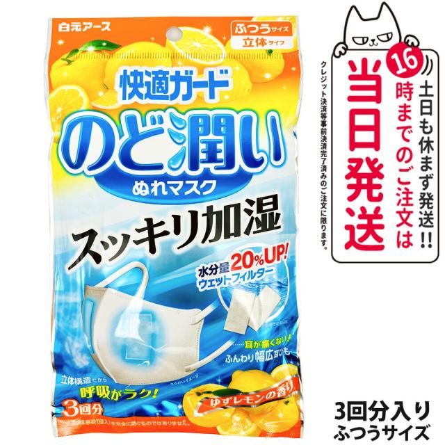 白元アース 快適ガード のど潤いぬれマスク ゆずレモンの香り ウェットフィルター ふつうサイズ 3回分入 水分量20%アップ 加湿マスク日本製 送料無料