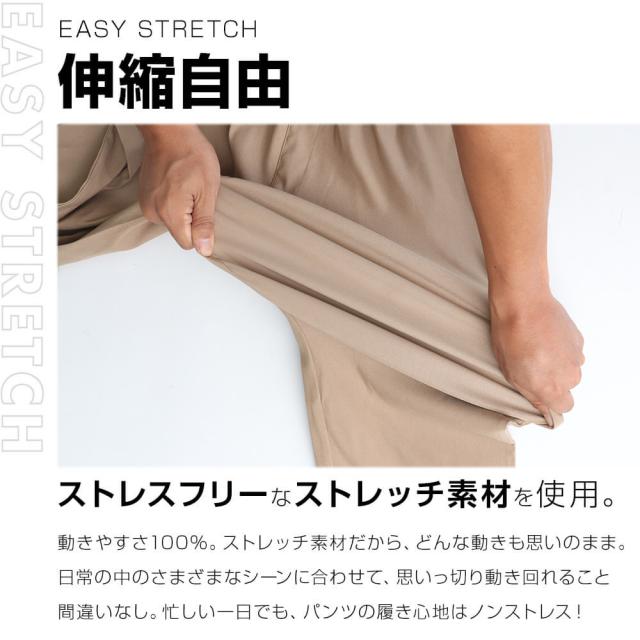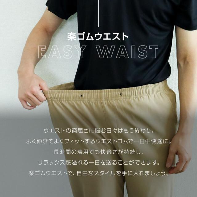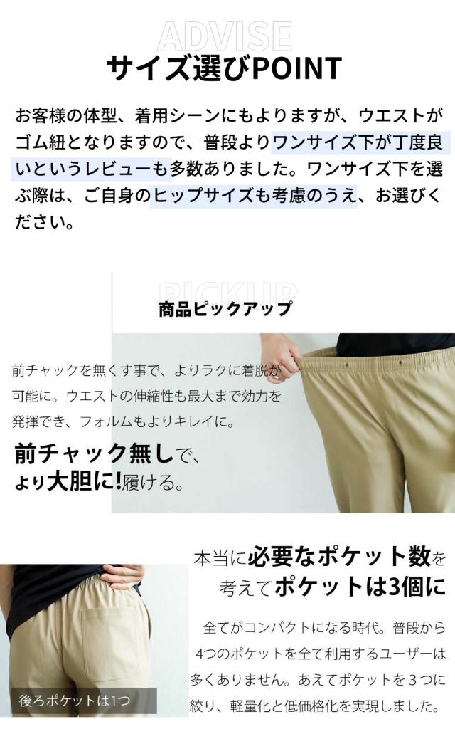ウエストもゴムなので、しゃがんでも、椅子に座ってもストレスなく過ごせます。着用シーンに関しては、シルエットがレギュラーテーパードとなっている為、カジュアルからビジネスまで問題無く履いて頂けます。このチノパンにジャケットを合わせても◎。少しワイドに履きたい方は、ワンサイズ上もおすすめです。