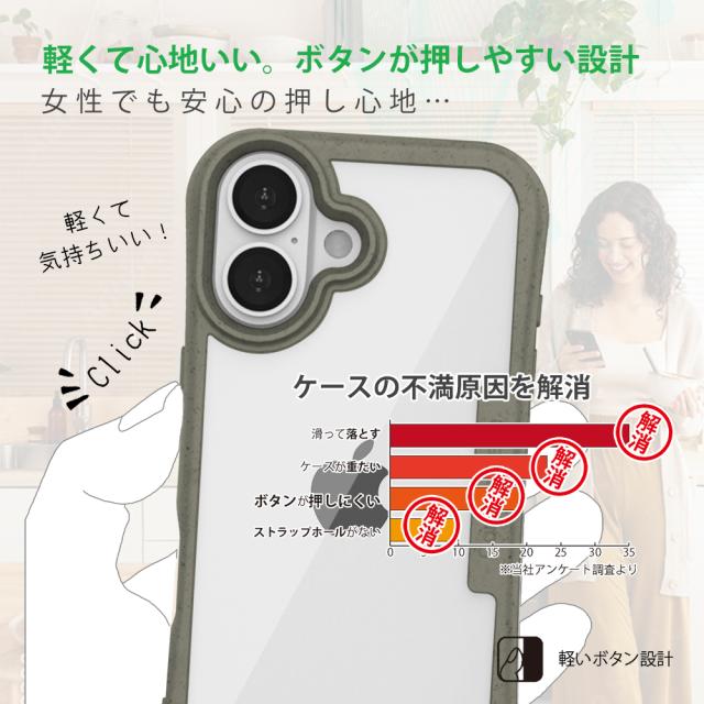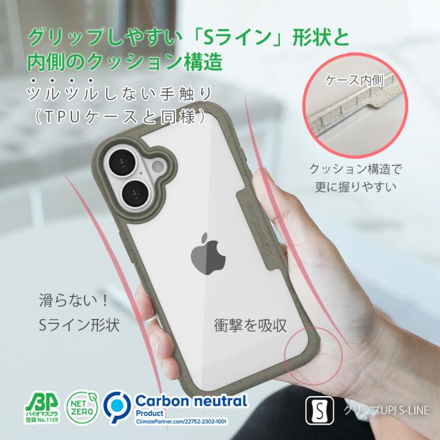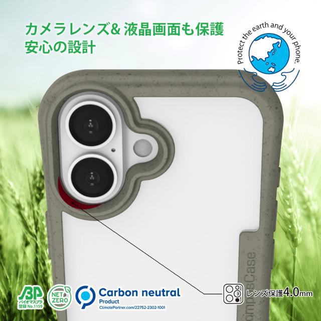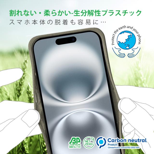 | ケースについて | 背面の内側に入れ込むデザインシートで、シーンに合わせて着せ替え可能。また、グリップしやすいクッション構造で、本体重量は36gと軽減化を実現。さらに衝撃に強いSライン形状、究極に押しやすいボタン設計(切り込みが入ることで押し込む力を軽減)、背面のカメラ・レンズを保護する高さ設計となっております。生分解性プラスチック素材ながらも着脱もしやすく、割れない・指紋防止加工を施しています。 |