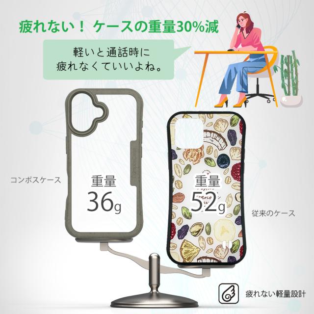 | 商品説明 | コンポスケースは、環境負荷低減を目的に開発されたスマホケース。従来のスマホケースと比べ、CO2排出量を50%削減できます。しかも、循環型社会に対応した素材を使ったケースです。![]() |