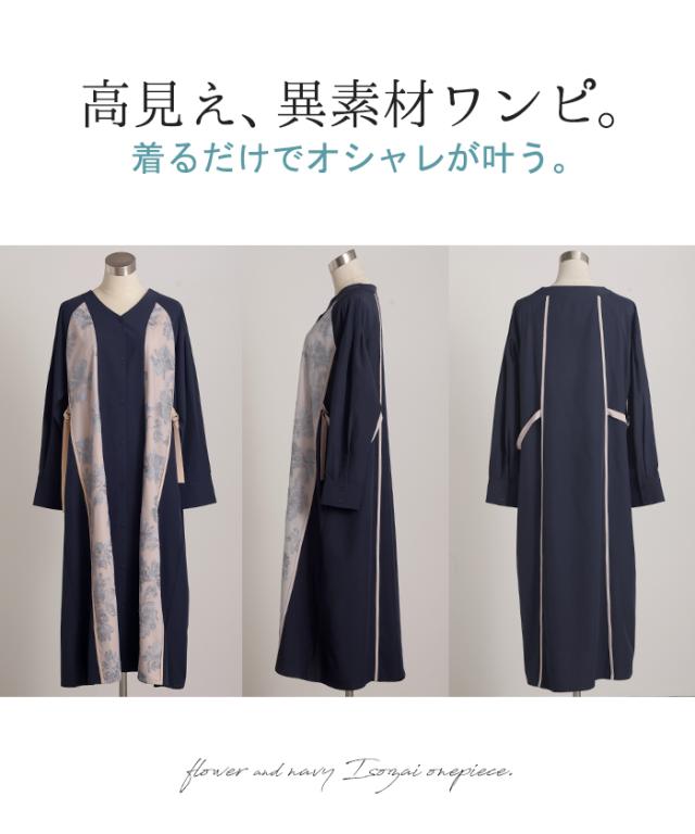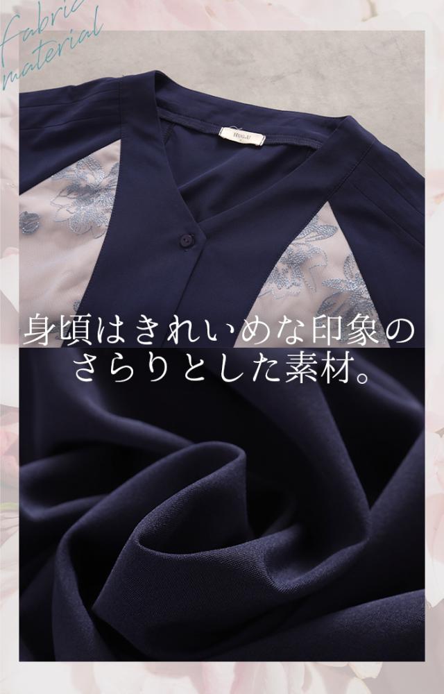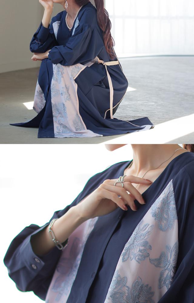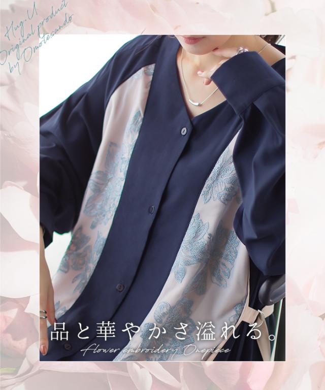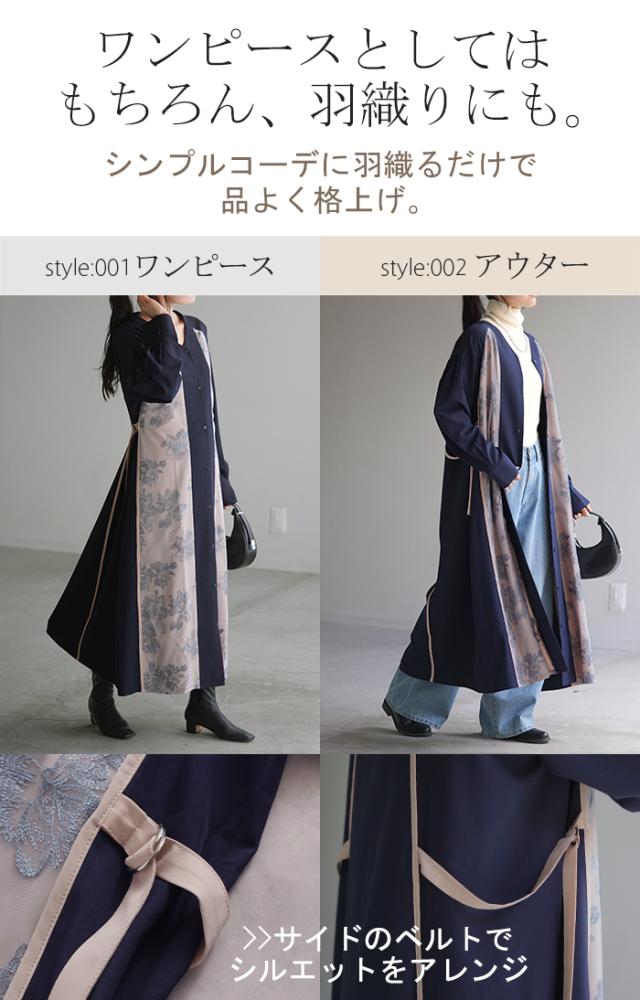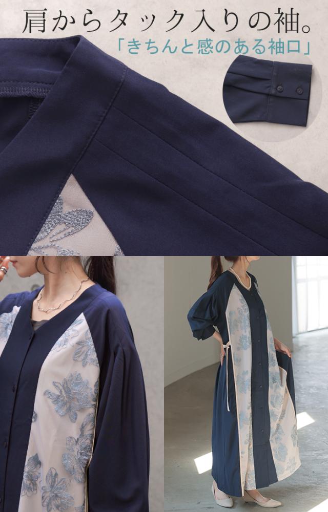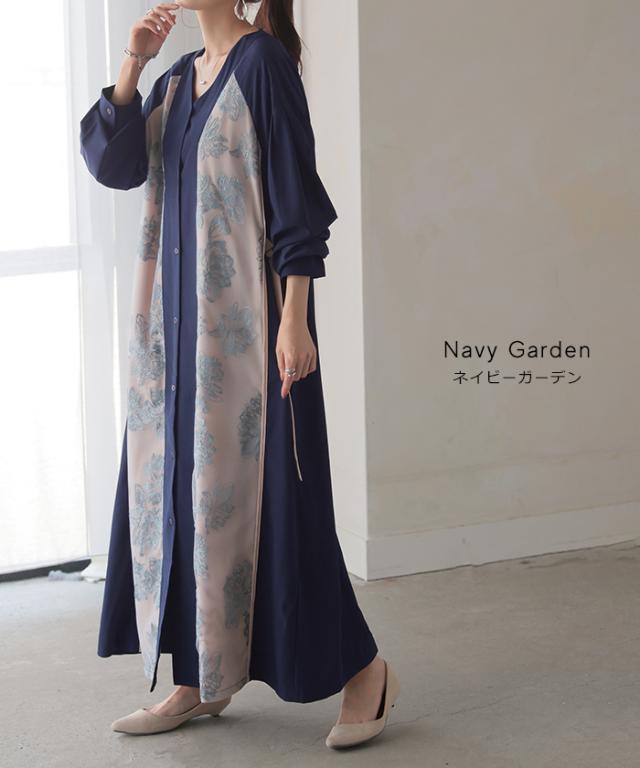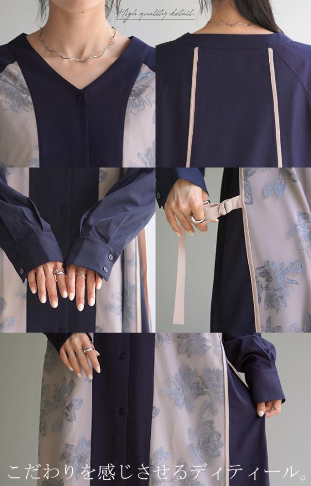 ワンピース 花柄 刺繍 異素材 レディース Vネック 長袖 ロング ロングワンピース マキシ フレア Aライン フラワー パイピング ライン ウエストマーク 羽織 ノーカラー 透け メッシュ 大きいサイズ 体型カバー 上品 きれいめ ネイビー 紺色 秋 冬 HUG.U 秋新作