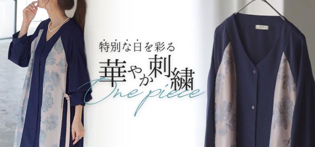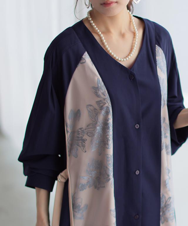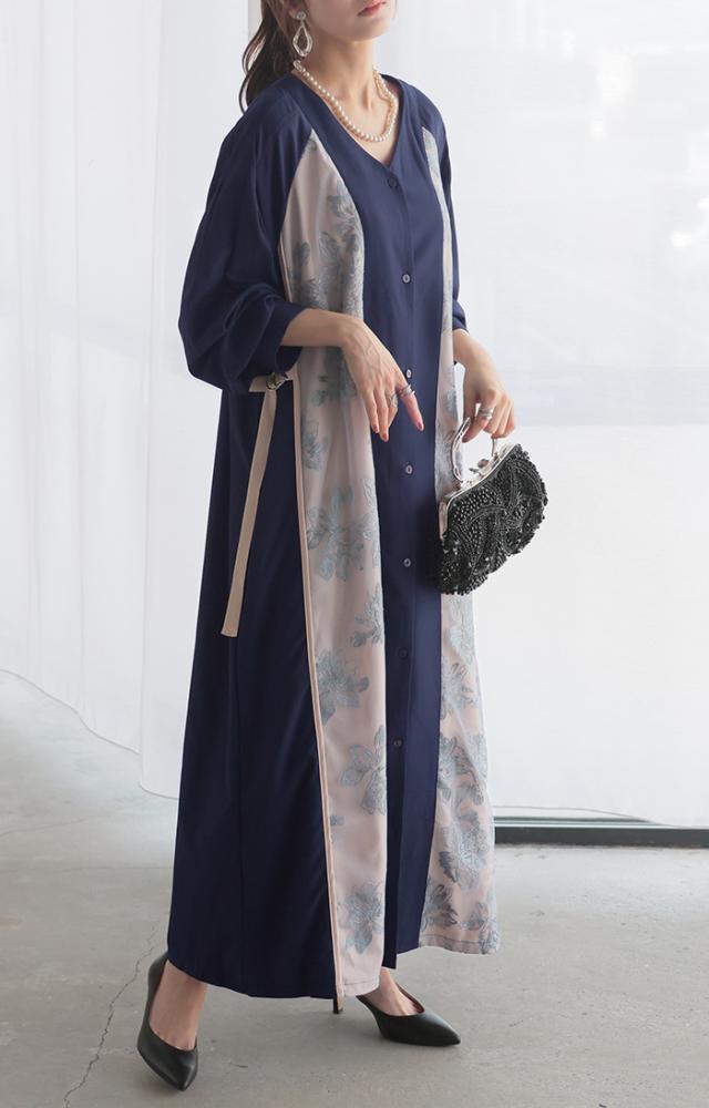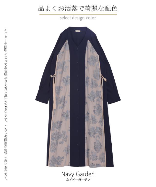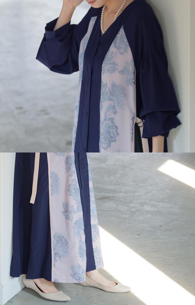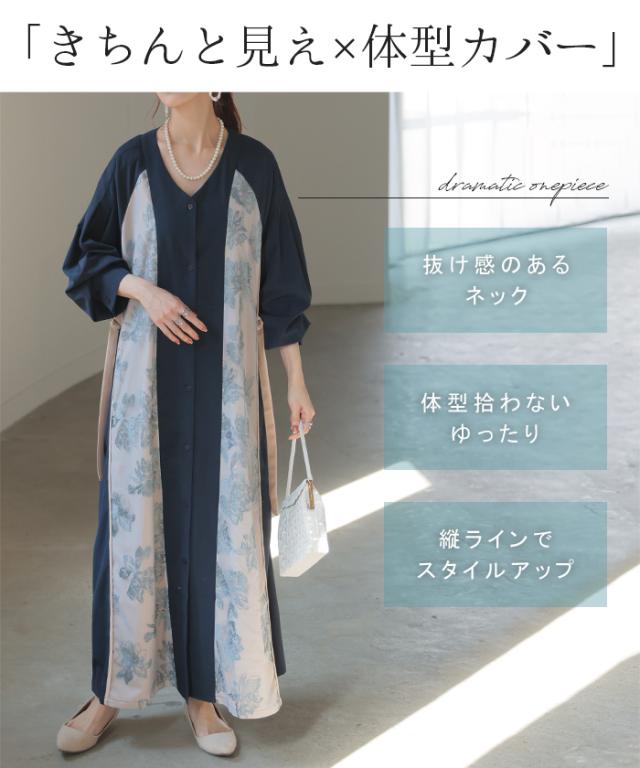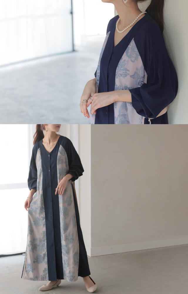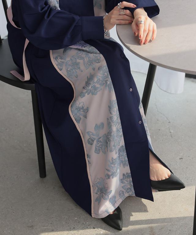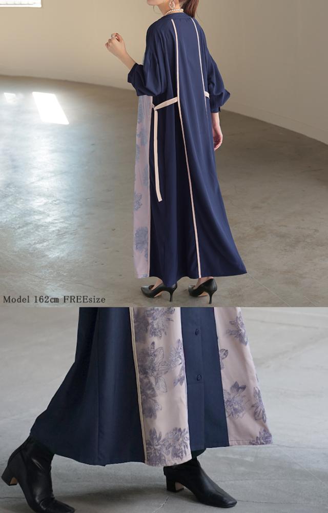 ワンピース 花柄 刺繍 異素材 レディース Vネック 長袖 ロング ロングワンピース マキシ フレア Aライン フラワー パイピング ライン ウエストマーク 羽織 ノーカラー 透け メッシュ 大きいサイズ 体型カバー 上品 きれいめ ネイビー 紺色 秋 冬 HUG.U 秋新作
