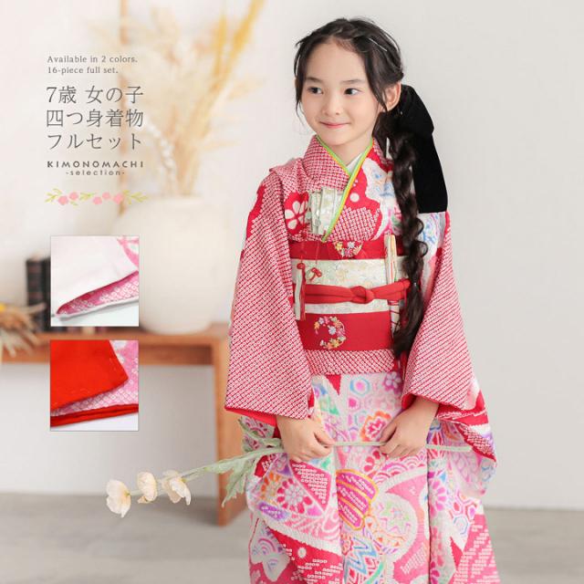七歳の七五三(四つ身着物)の着付けに必要なものが揃ったフルセットです。お洒落で女の子らしい雰囲気。