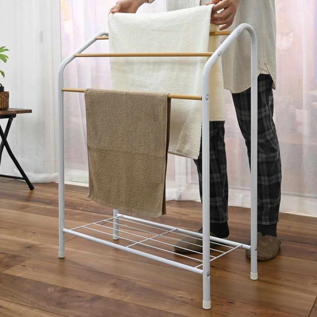 少量の物干しに便利なタオルスタンドです。ホワイトを基調にしたナチュラルでシンプルなデザインなので、ランドリースペースやリビングに出しっぱなしにしていても、インテリアに馴染みます。