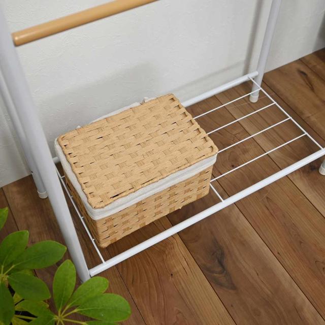 下部には、棚が付いているのでランドリースペースで使う小物などタオル以外の物も収納できます。棚は、ハンドタオルを2枚を広げて干せるサイズです。