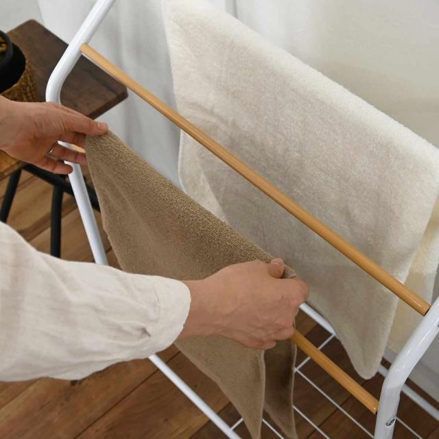 少量の物干しに便利なタオルスタンドです。ホワイトを基調にしたナチュラルでシンプルなデザインなので、ランドリースペースやリビングに出しっぱなしにしていても、インテリアに馴染みます。