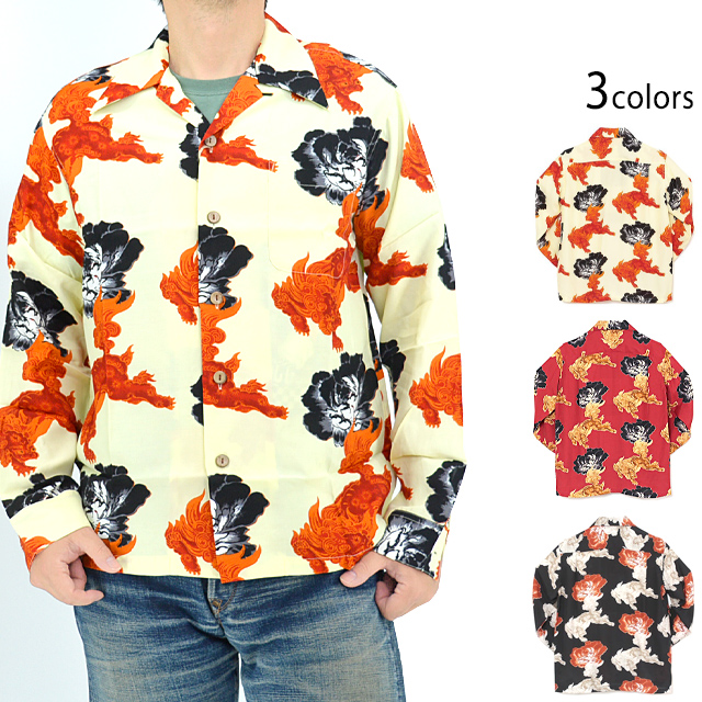 獅子と牡丹を組み合わせた総柄デザインが渋みのある、長袖アロハシャツが登場しました。