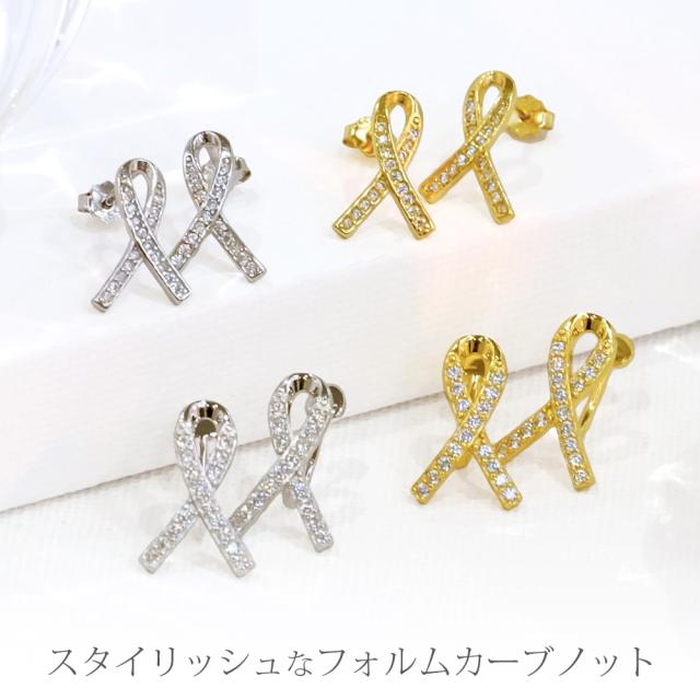 ジルコニアが煌めくリボンをくるりと一回転させたカーブノットは、リボンモチーフの中でも甘くなり過ぎずスタイリッシュに使えます。