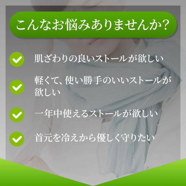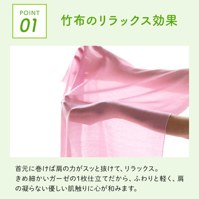 適度に湿気を吸放湿する竹布は一年を通して心地良さが続きます。 冬はあたたかく首元を守り、夏場はムレずに快適。 肌寒い時期には、ちょっとした肩掛けやひざ掛けにも。