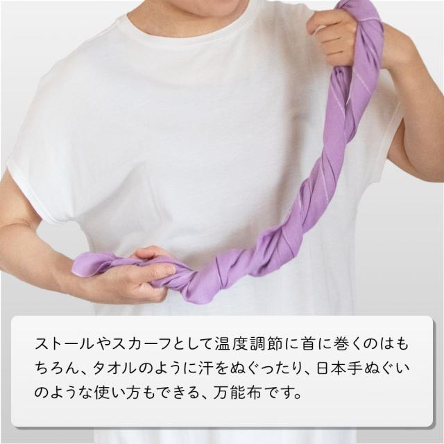 ストールやスカーフとして温度調節に首に巻くのはもちろん、タオルのように汗をぬぐったり、日本手ぬぐいのような使い方もできる、万能布です。