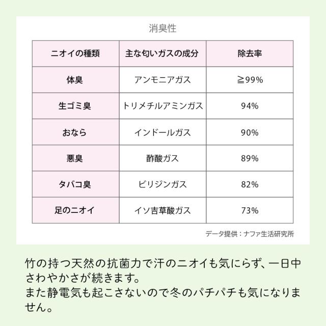 竹の持つ天然の抗菌・消臭力で汗のニオイも気にらず、一日中さわやかさが続きます。