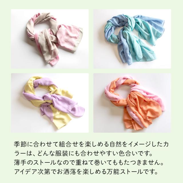 薄手のストールなので重ねて巻いてももたつきません。アイデア次第でお洒落を楽しめる万能ストールです。