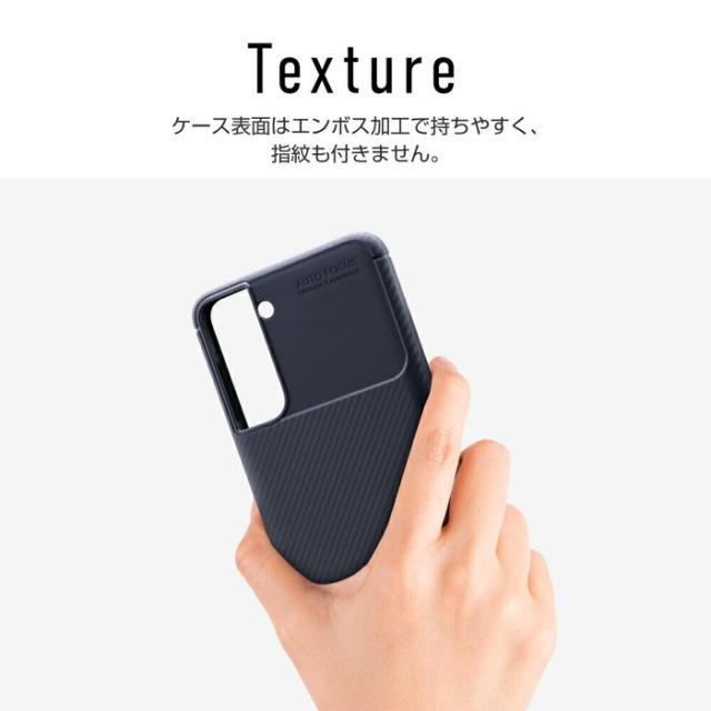エッジの効いたデザインが美しいカーボン調耐衝撃ケース/こだわりの設計でボタンやカメラ周囲まで細かく保護/角に衝撃を吸収するエアクッションを採用/柔軟性があるため手に馴染んでしっかり握れる。