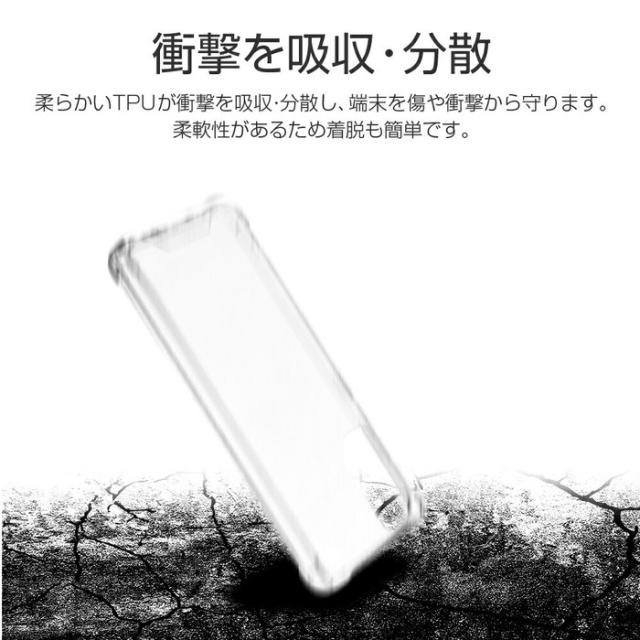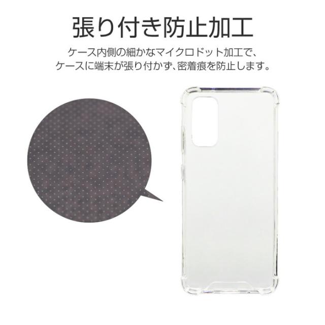 [耐衝撃] こだわりの設計で端末を保護/背面素材に硬く高透明なアクリル素材採用/カドにエアクッションを搭載し、落下の衝撃から守る/高透明で柔らかなTPUを使用/柔軟性があり着脱が簡単/ストラップホール搭載