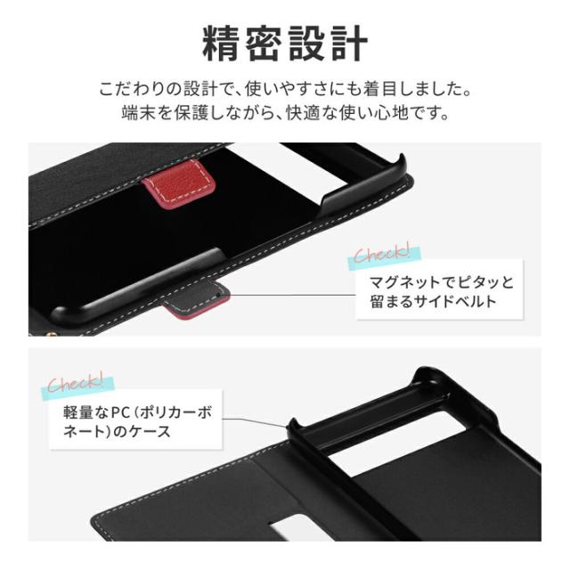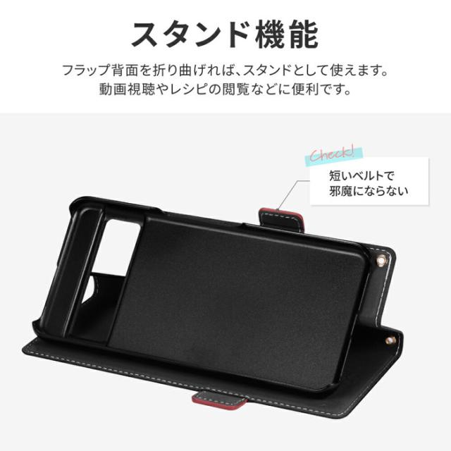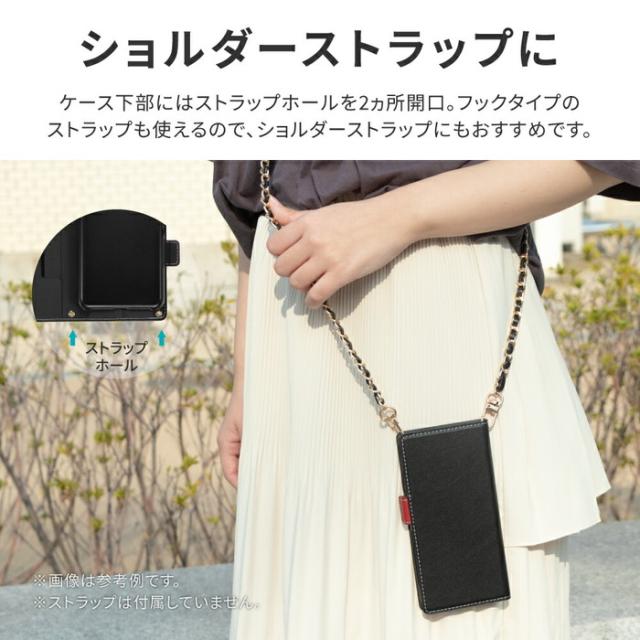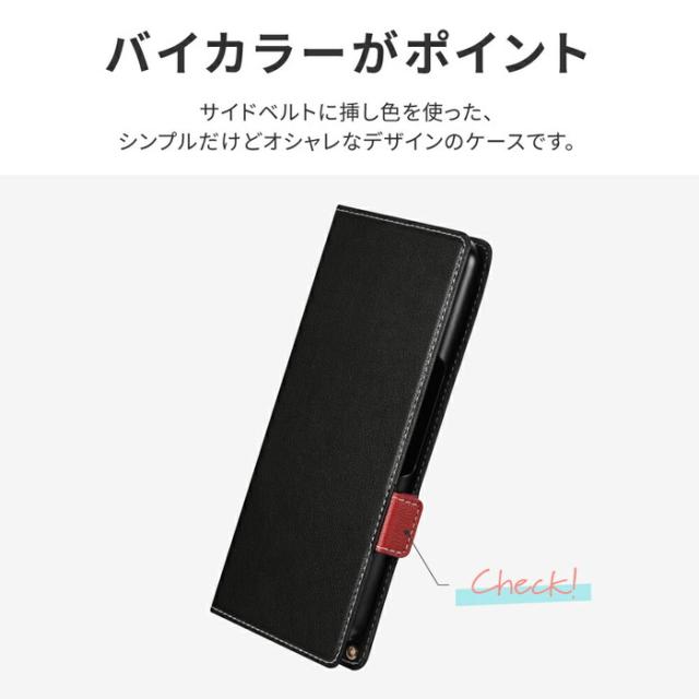 サイドベルトがバイカラーになった遊び心ある手帳型ケース/ピタッと固定できるマグネット仕様/すぐ取り出せて嵩張らないカード収納ポケット(1枚)/動画視聴に最適なスタンド機能/ショルダーストラップが使える2つのホール搭載。