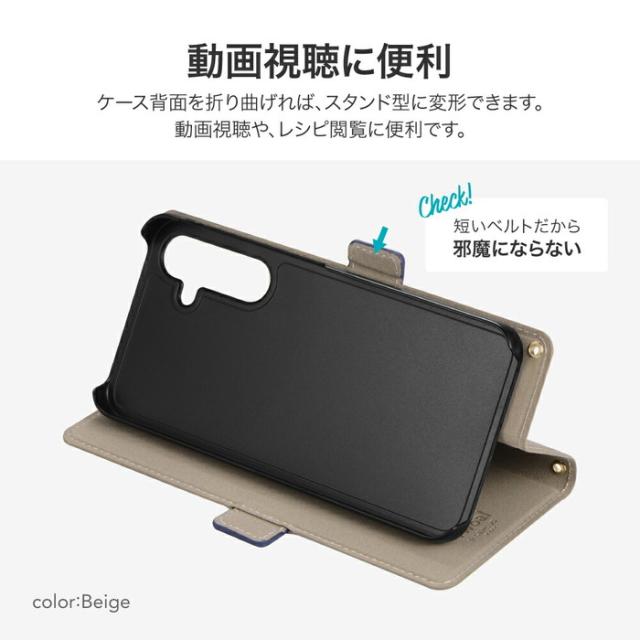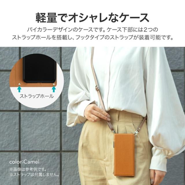サイドベルトがバイカラーになった遊び心ある手帳型ケース/ピタッと固定できるマグネット仕様/すぐ取り出せて嵩張らないカード収納ポケット(1枚)/動画視聴に最適なスタンド機能/ショルダーストラップが使える2つのホール搭載。