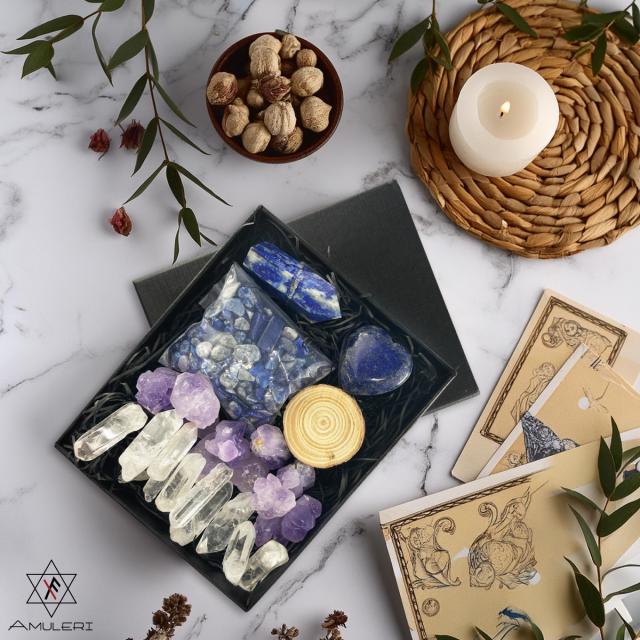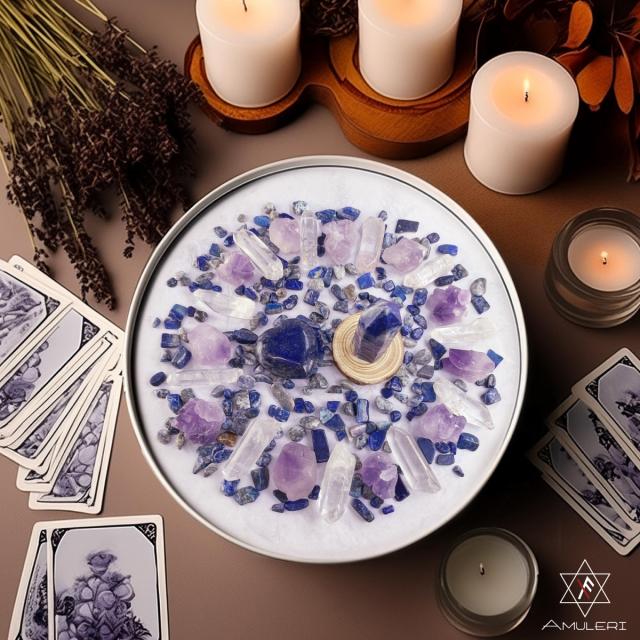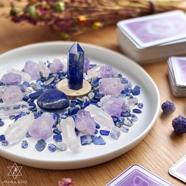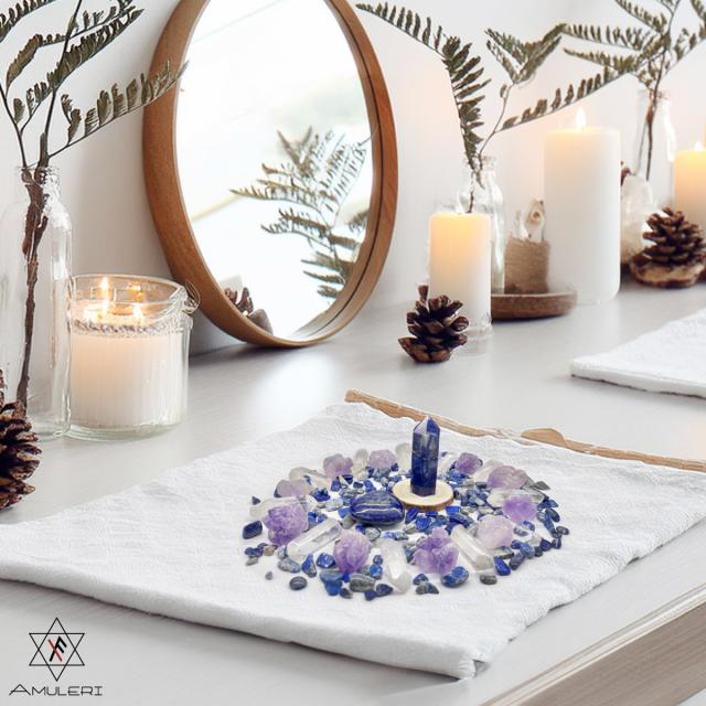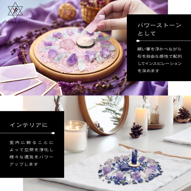 ★「ラピスラズリ・アメジスト・クリスタル」の豪華な組み合わせのパワーストーンセット。願い事を浮かべながら石を放射状に並べてインスピレーションを深め、自分だけの特別なパワースポットを作ります。