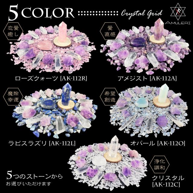・クリスタルグリッドは「ローズクォーツ・アメジスト・ラピスラズリ・オパール・クリスタル」の、5つのセットからお選びいただけます。