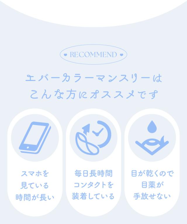 ●コンタクトレンズは目に直接のせて使用するため、少しでも異常を感じた場合はご使用を中止し眼科医へご相談ください。眼のトラブルに関しまして弊社は医療上の責任は一切負いません。ご自身の責任にてご利用ください。