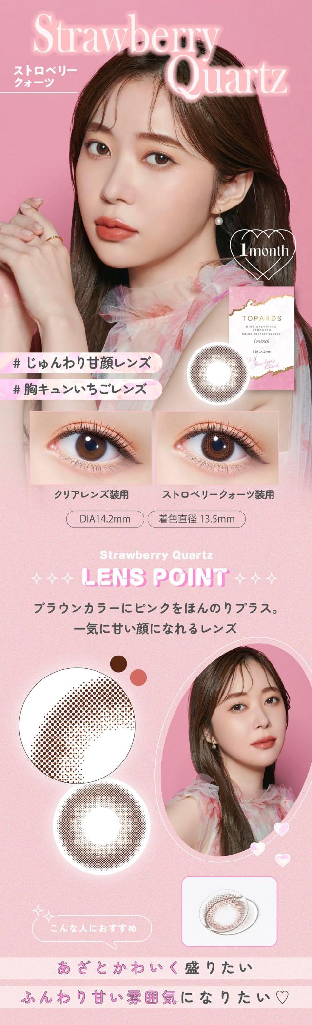 | ◆スペック◆ | 直径(DIA):14.2mm ベースカーブ(BC):8.6mm 着色直径:13.4mm(デートトパーズ),13.5mm(ストロベリークォーツ、ガーネット) |