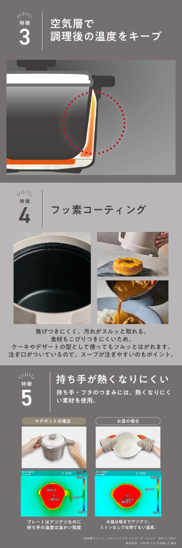レンジメート マグポットの発熱体は、フライパンと同等の温度まで上がりますが、断熱構造のため持ち手や底面は熱くなりにくい構造です。