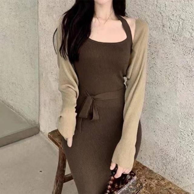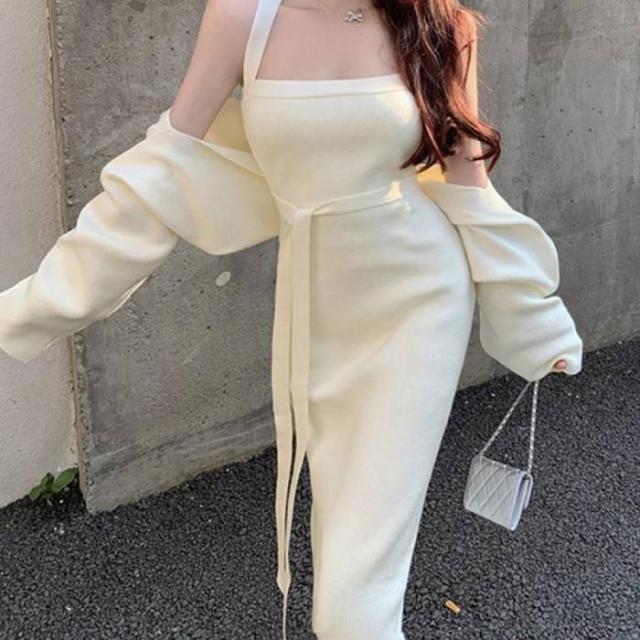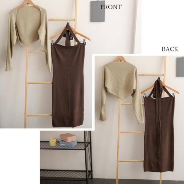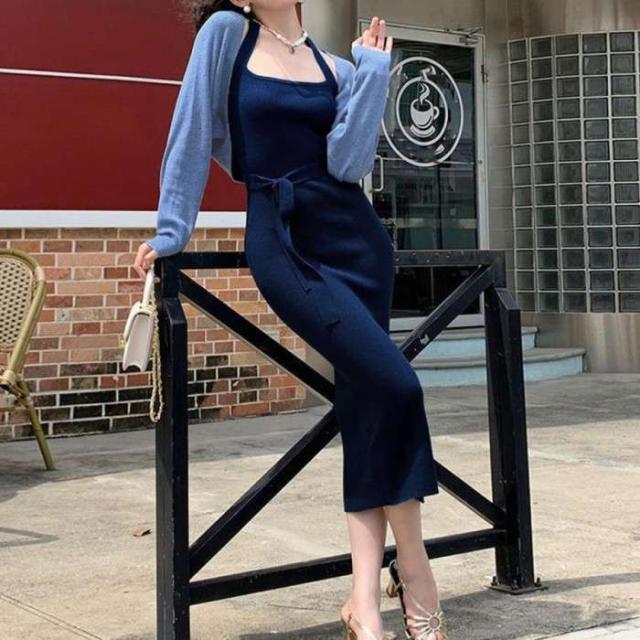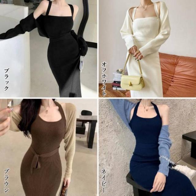 ワンピース ショート丈カーディガン 長袖ボレロノースリーブ ロングワンピース 着やせ ボレロ風ショートカーデにタイトめキャミワンピがフェミニンな印象を与える韓国DESIGNのリブニット2点セット