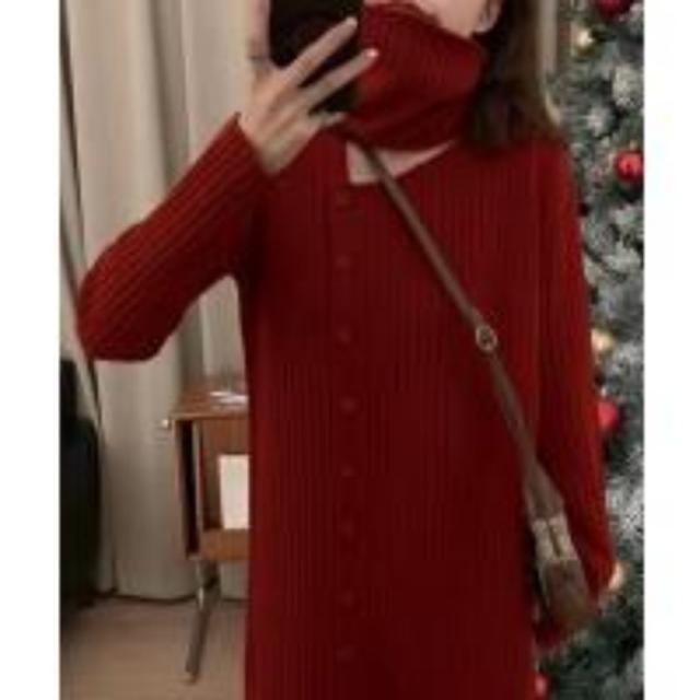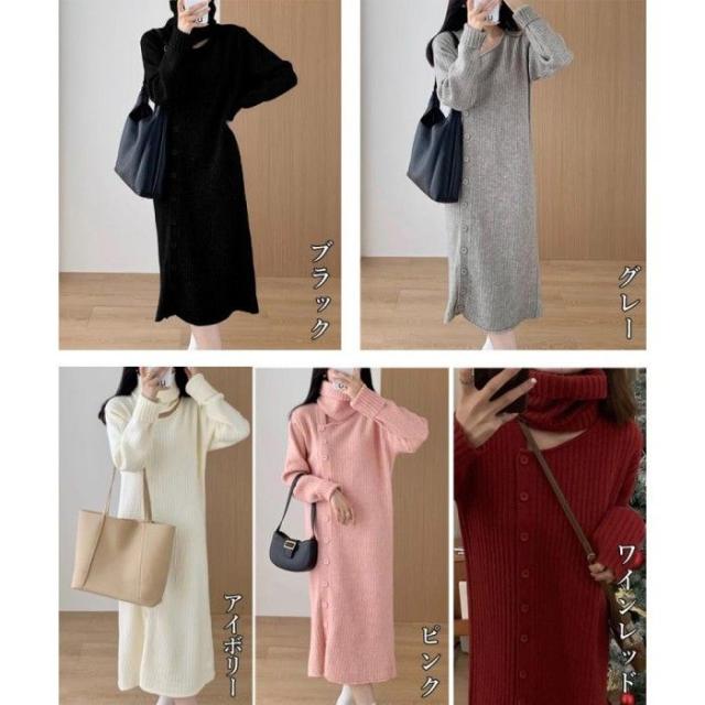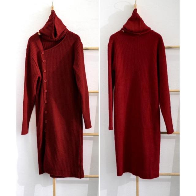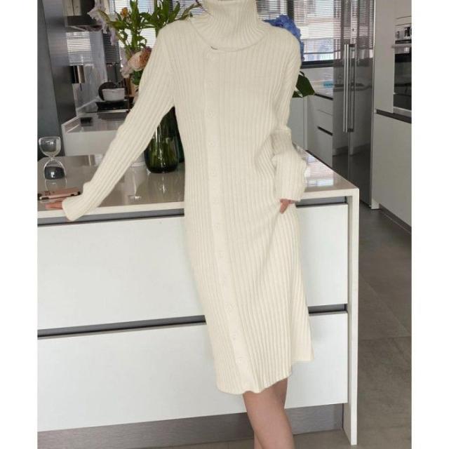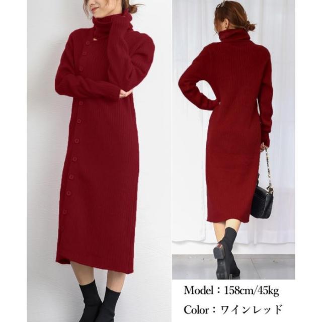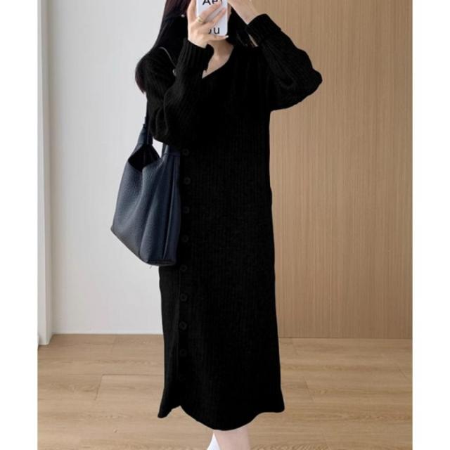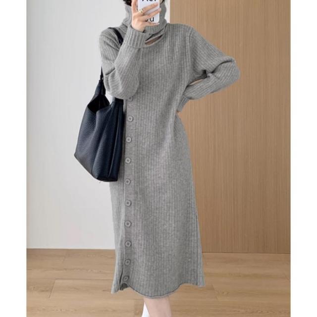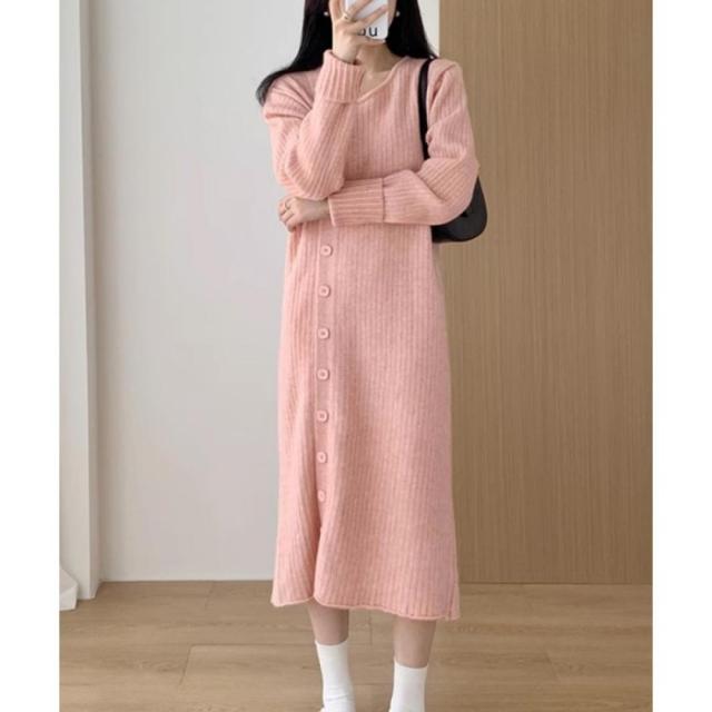 フロントボタンがアクセントに、リブ編みが縦のラインを強調し、ボディラインを美しく見せてくれるリブニットロングワンピース
