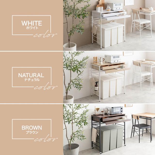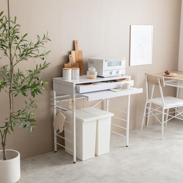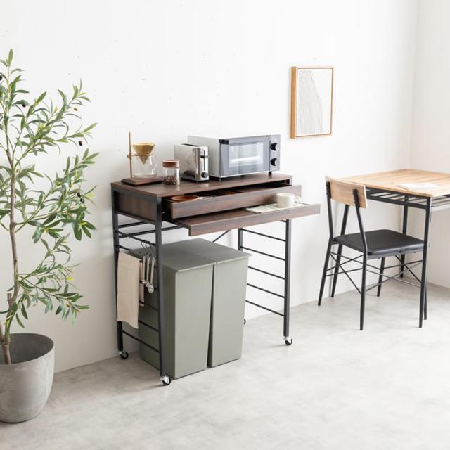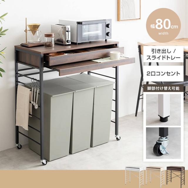 天板には2口コンセントが付いているため、電子レンジやトースターなどのキッチン家電をすぐに使用でき、電源の心配も不要です。