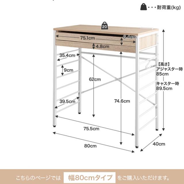 本体サイズ: 幅 80cm × 奥行 40cm × 高さ キャスター装着時 89.5cm アジャスタ装着時 85cm商品重量: 約15.2kg