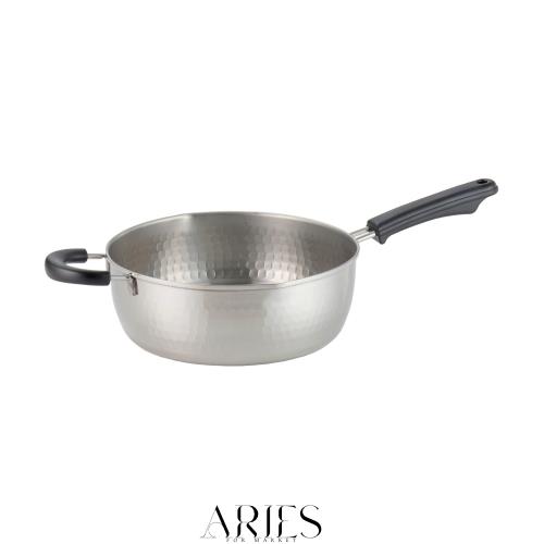 丈夫でサビにくいステンレス製雪平鍋利き手を選ばずに注げる両口タイプ高級感のある槌目模様お鍋の移動や料理の移し替えに便利な補助ハンドル付き