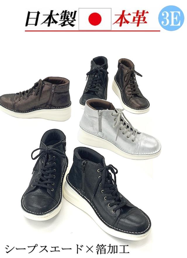 日本製 本革 スニーカー ハイカット レディース レザースニーカー 紐 レースアップ 幅広3e 外反母趾 ショートブーツ スエード ハイカットスニーカー 軽量 軽い 履きやすい 歩きやすい 痛くない