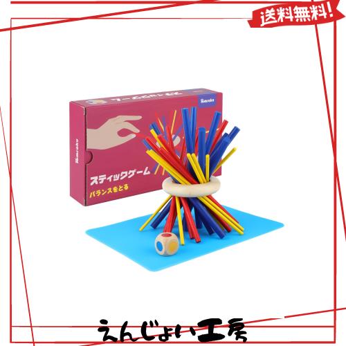 【材質・仕様】:高級な樺の木で作られ、適度な重さで手触りがとても良く、安全の塗料を採用し特殊マット仕上げで安心・安全に繋ぎます。セット内容:青スティック(大)9本、赤スティック(中)9本、黄色スティック(小)9本、木の輪1個、サイコロ1個。パッケージサイズ:23cm×10.5cm×3cm。対象年齢:6歳以上。机の上に木製バランスゲームを遊び時、置く場所の素材によって、スティックが滑り易くなることを防ぐために、滑り止めマットを用意いたしましたので、ご安心して楽しめましょう。