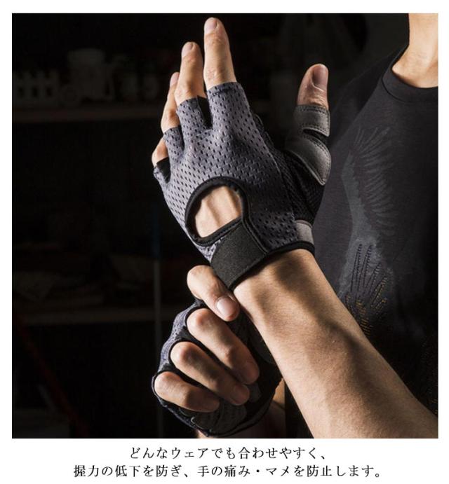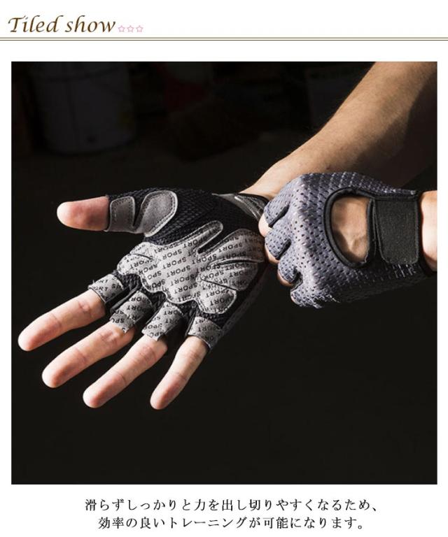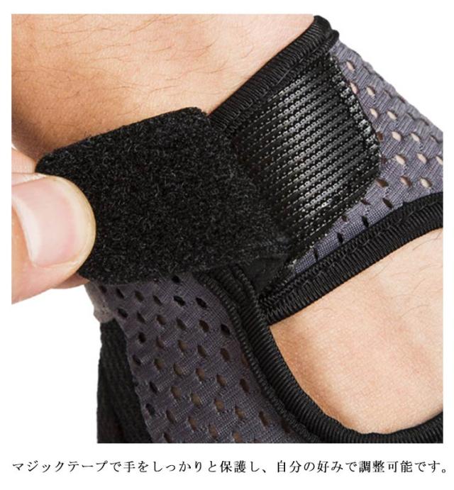 | ウェイトリフティング等、ジムでのトレーニング時に最適です。 手の甲側はメッシュ素材で通気性を高め、快適なトレーニングをサポートします。 滑らずしっかりと力を出し切りやすくなるため、効率の良いトレーニングが可能になります。 マジックテープで手をしっかりと保護し、自分の好みで調整可能です。 汗をかいても脱ぎやすいような指デザイン。 どんなウェアでも合わせやすく、握力の低下を防ぎ、手の痛み・マメを防止します。 | |