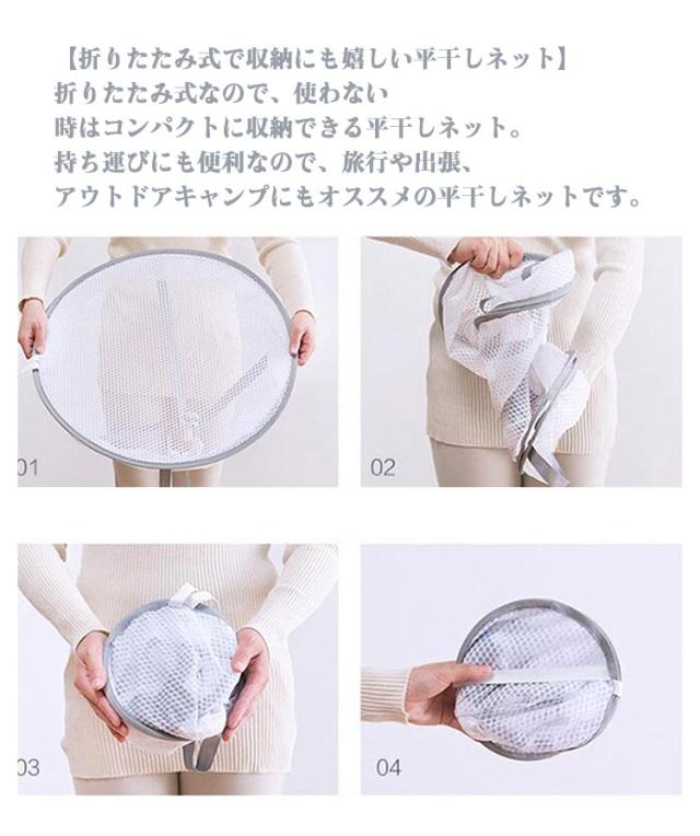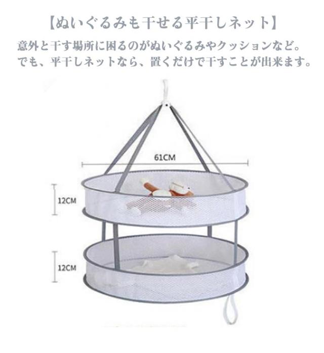 | 【崩れしないで洗濯物を干せる平干しネット】 洗濯バサミやハンガーの跡が付かないで、型型崩れもしないで洗濯物を干すことが出来る平干しハンガー。折り畳み式なので、アウトドアキャンプなどへの持ち運びや収納にも便利な平干しハンガーです。 【ぬいぐるみも干せる平干しネット】 意外と干す場所に困るのがぬいぐるみやクッションなど。でも、平干しネットなら、置くだけで干すことが出来ます。 【靴下などの小物をラクに干せる平干しネット】 靴下や下着、手袋などの小物類を、ひとつひとつ洗濯バサミに引っ掛けることなく、ネットに置くだけで干すことが出来る平干しネット。物干しハンガーとは違って、中身がパっと見えにくいので、下着類の物干しにもオススメの平干しネットです。 【折りたたみ式で収納にも嬉しい平干しネット】 折りたたみ式なので、使わない時はコンパクトに収納できる平干しネット。持ち運びにも便利なので、旅行や出張、アウトドアキャンプにもオススメの平干しネットです。 | |