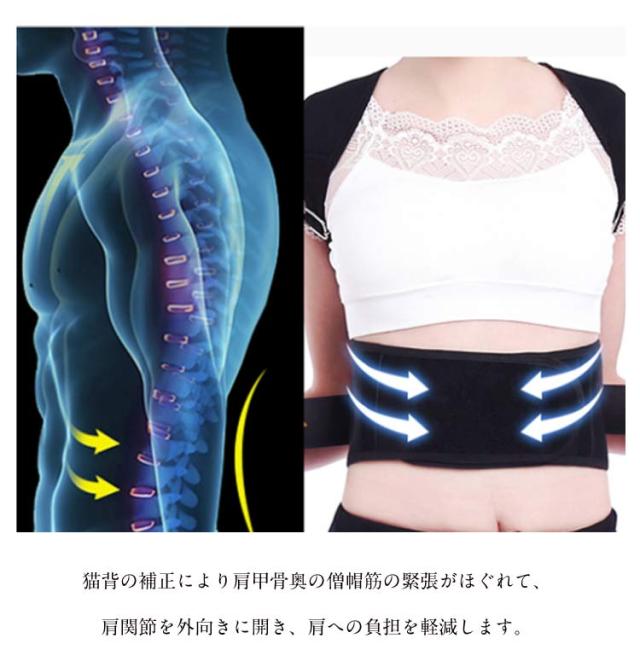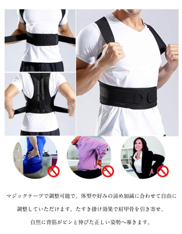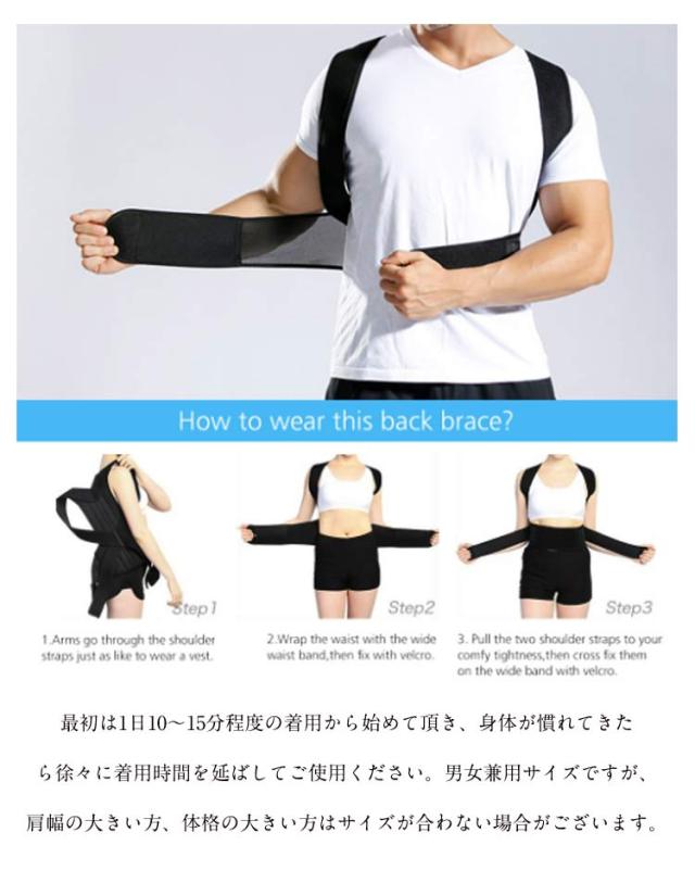 | 手軽につけられる、人体工学に基づいた設計の背筋サポーターです。 着用時に美しい姿勢を保ちます。猫背の補正、姿勢の補正に。着用することで美しい姿勢を自然と体に意識させることができます。 猫背の補正により肩甲骨奥の僧帽筋の緊張がほぐれて、肩関節を外向きに開き、肩への負担を軽減します。 通気性とクッション性に優れた素材を使用しており、蒸れにくくフィット感も抜群です。毎日気軽に着用して頂けます。 マジックテープで調整可能で、体型や好みの諦め加減に合わせて自由に調整していただけます。たすき掛け効果で肩甲骨を引き寄せ、自然に背筋がピンと伸びた正しい姿勢へ導きます。 最初は1日10〜15分程度の着用から始めて頂き、身体が慣れてきたら徐々に着用時間を延ばしてご使用ください。男女兼用サイズですが、肩幅の大きい方、体格の大きい方はサイズが合わない場合がございます。 | |
