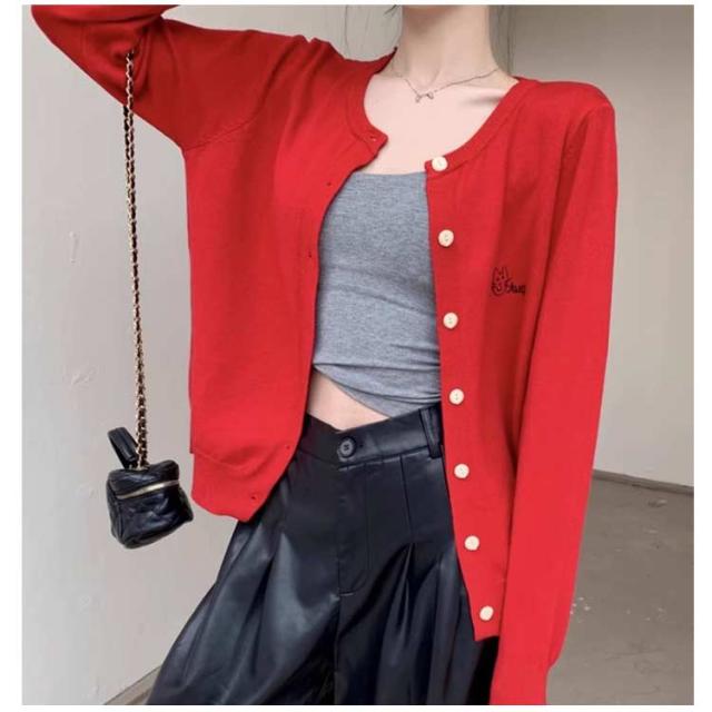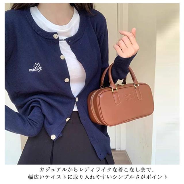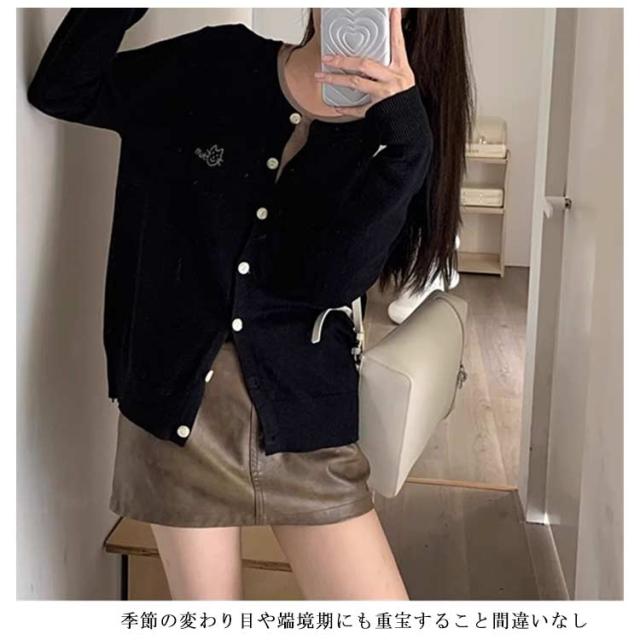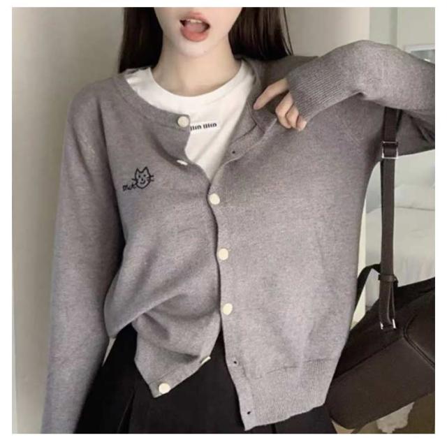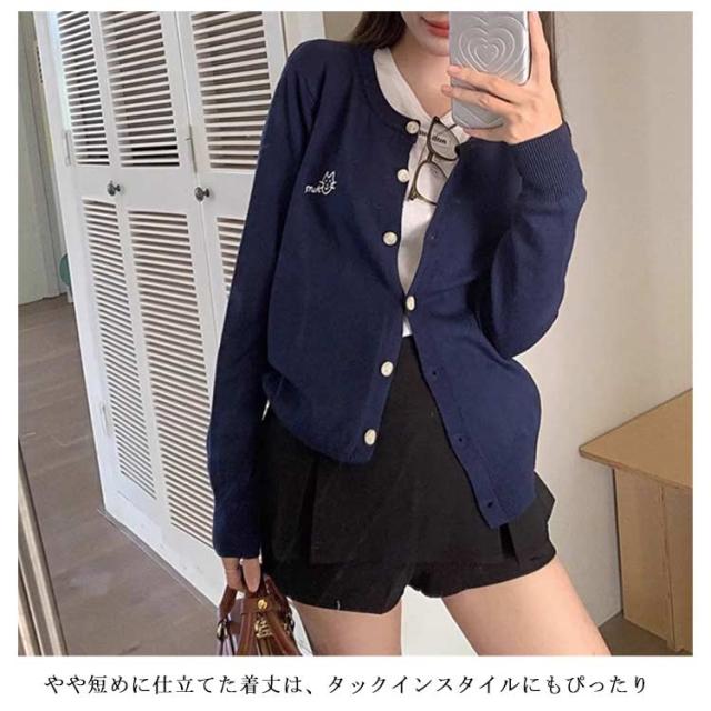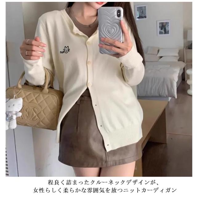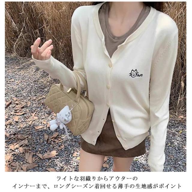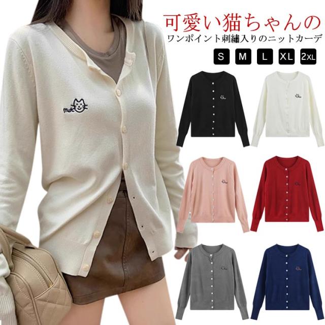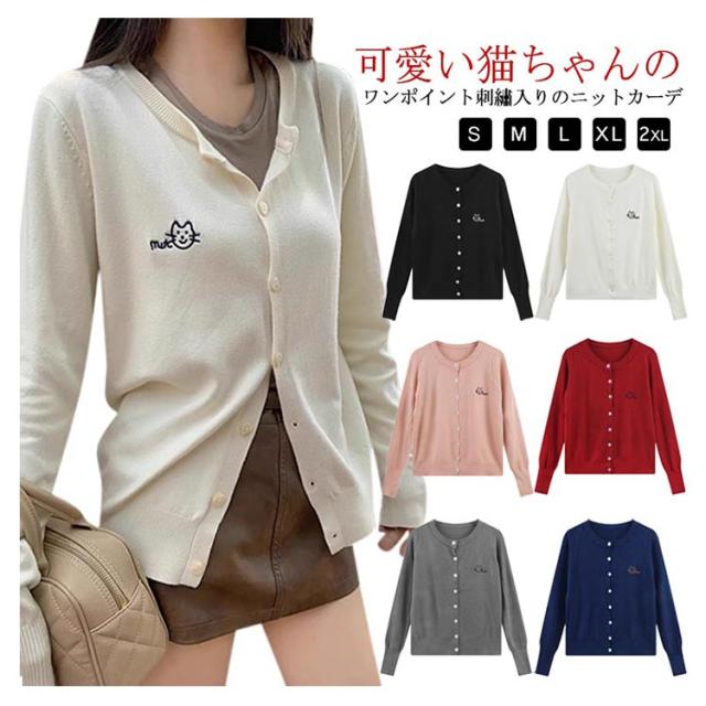 ニットカーディガン 秋 冬 クルーネック レディース ニット カーデ 猫 ネコ ワンポイント 刺? カーディガン 羽織り 春夏 薄手 丸首 ゆったり ショート丈 長袖 ニットトップス 大人可愛い きれいめ シンプル 秋物 秋服 【送料無料】