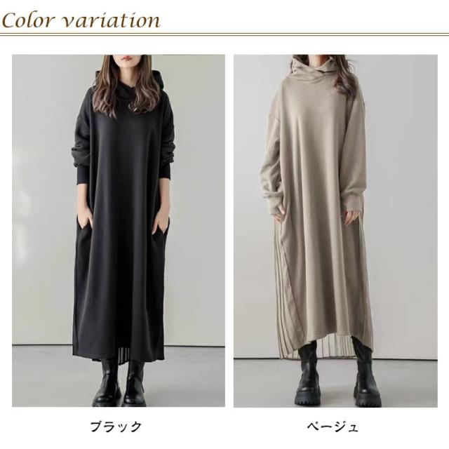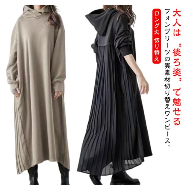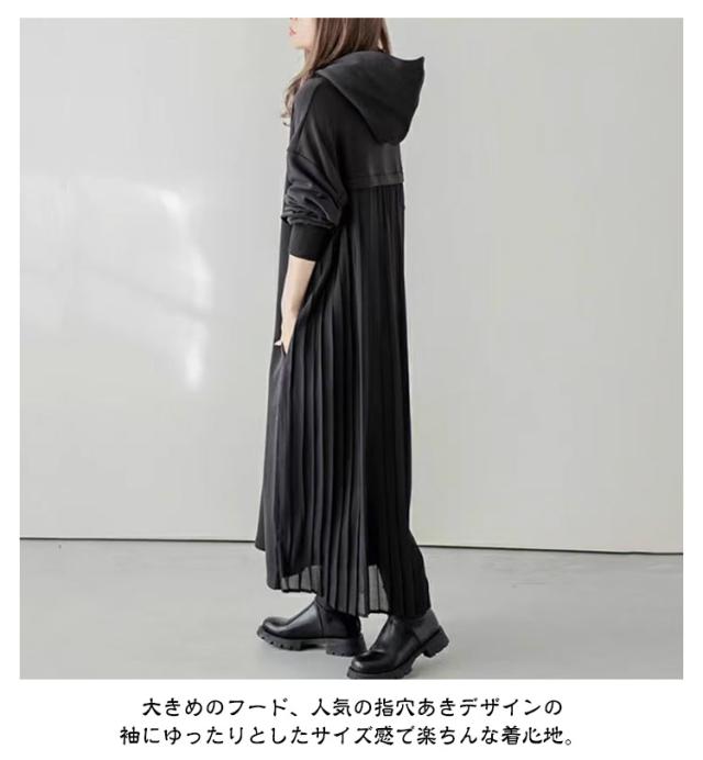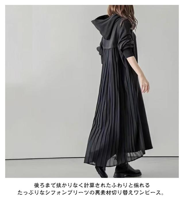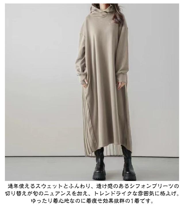 異素材 切り替え 春秋 レディース プリーツワンピース プリーツワンピース シフォン 長袖 ワンピース ロング フーディー パーカー スウェット トレーナー おしゃれ ロングワンピース ロンT Tシャツワンピ マキシ ワンピ プルオーバー カジュアル